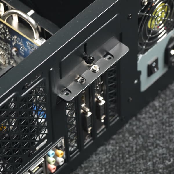 Еще одно оригинальное решение — подстраиваемый кронштейн для длинных видеокарт. Он имеет достаточно простую конструкцию: согнутая вдвое стальная полоса, поддерживающая видеокарту, закреплена на перемещающемся уголке при помощи подпружиненной петли. Уголок можно зафиксировать в нужном месте при помощи винта с обратной стороны основания для системной платы.