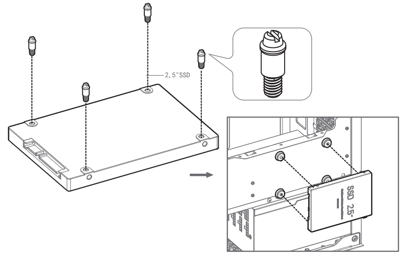 Конструкция этого крепления достаточно оригинальная. В накопитель вкручиваются винты с цилиндрической головкой, которые вставляются в резиновые втулки, вдетые в монтажные отверстия, то есть фиксация осуществляется только за счет силы трения.