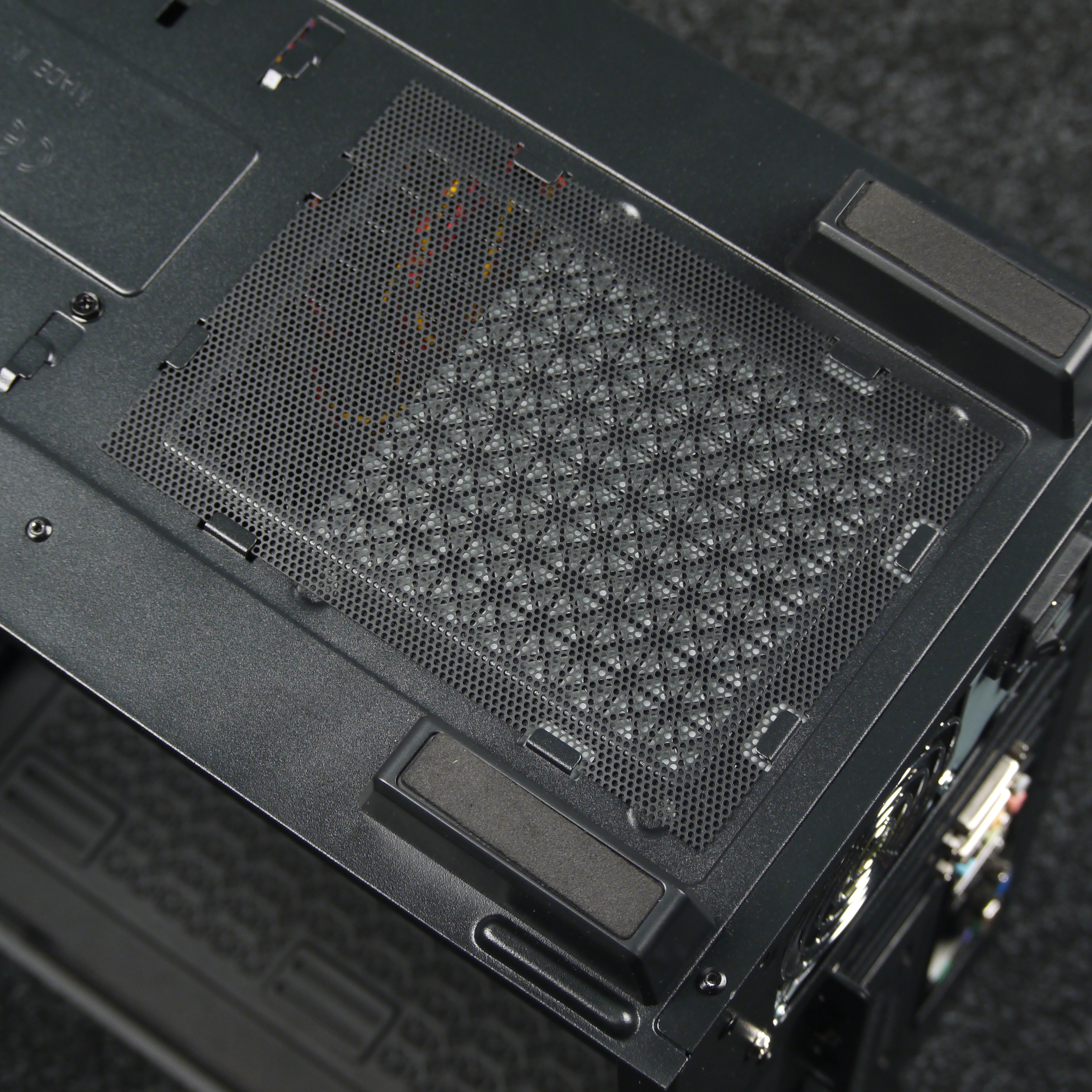 Верхняя панель выполнена из стали, в ней имеется вентиляционная решетка, которую закрывает сверху фильтр. Внутри между верхней стенкой и материнской платой достаточно много места — около 60 мм, что нетипично для дешевых корпусов.