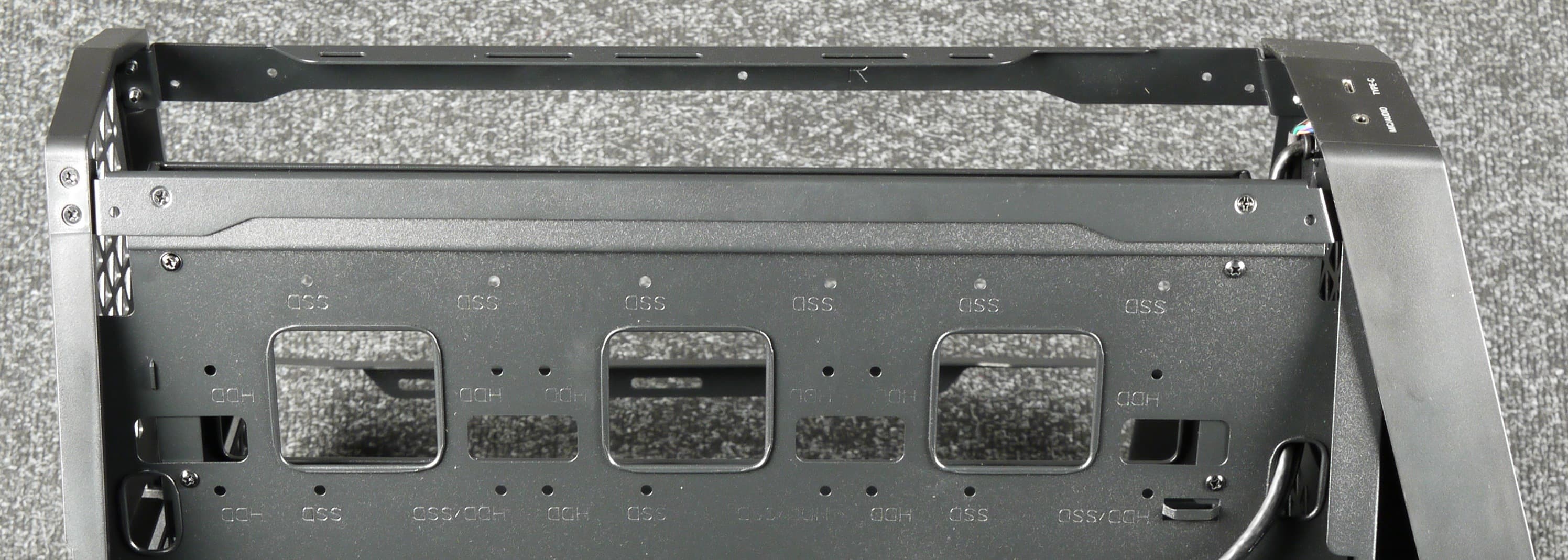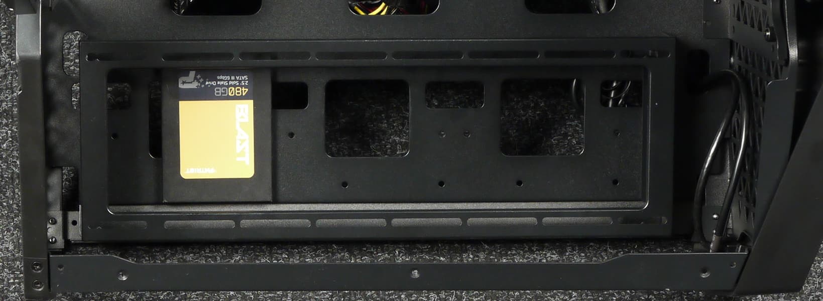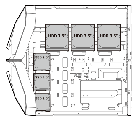 Все накопители в данном корпусе устанавливаются на лицевую сторону основания для системной платы с креплением сквозь него в дно накопителя. В горизонтальный ряд (снизу от системной платы) можно установить три накопителя типоразмера 2,5 или 3,5 дюйма на выбор, а в вертикальную колонну (справа от системной платы) можно установить только три накопителя типоразмера 2,5 дюйма.