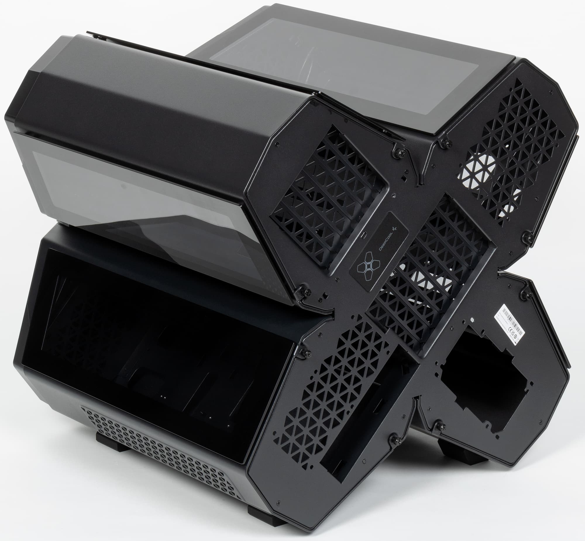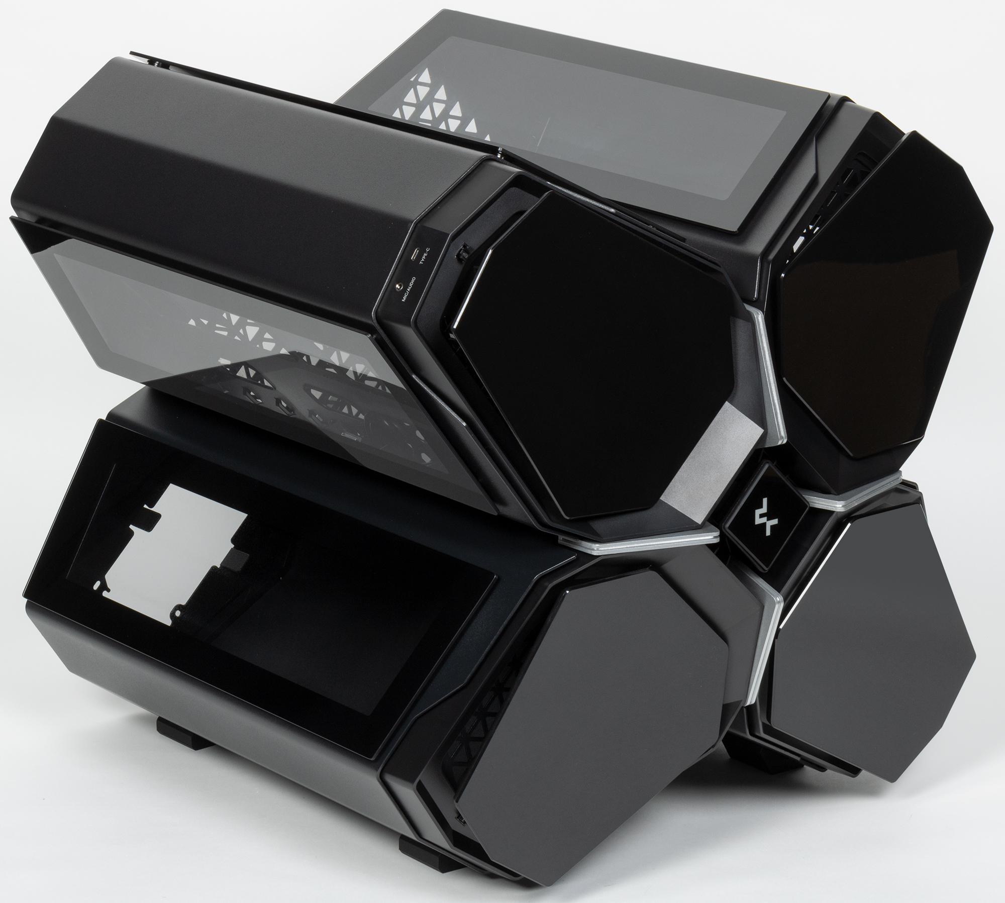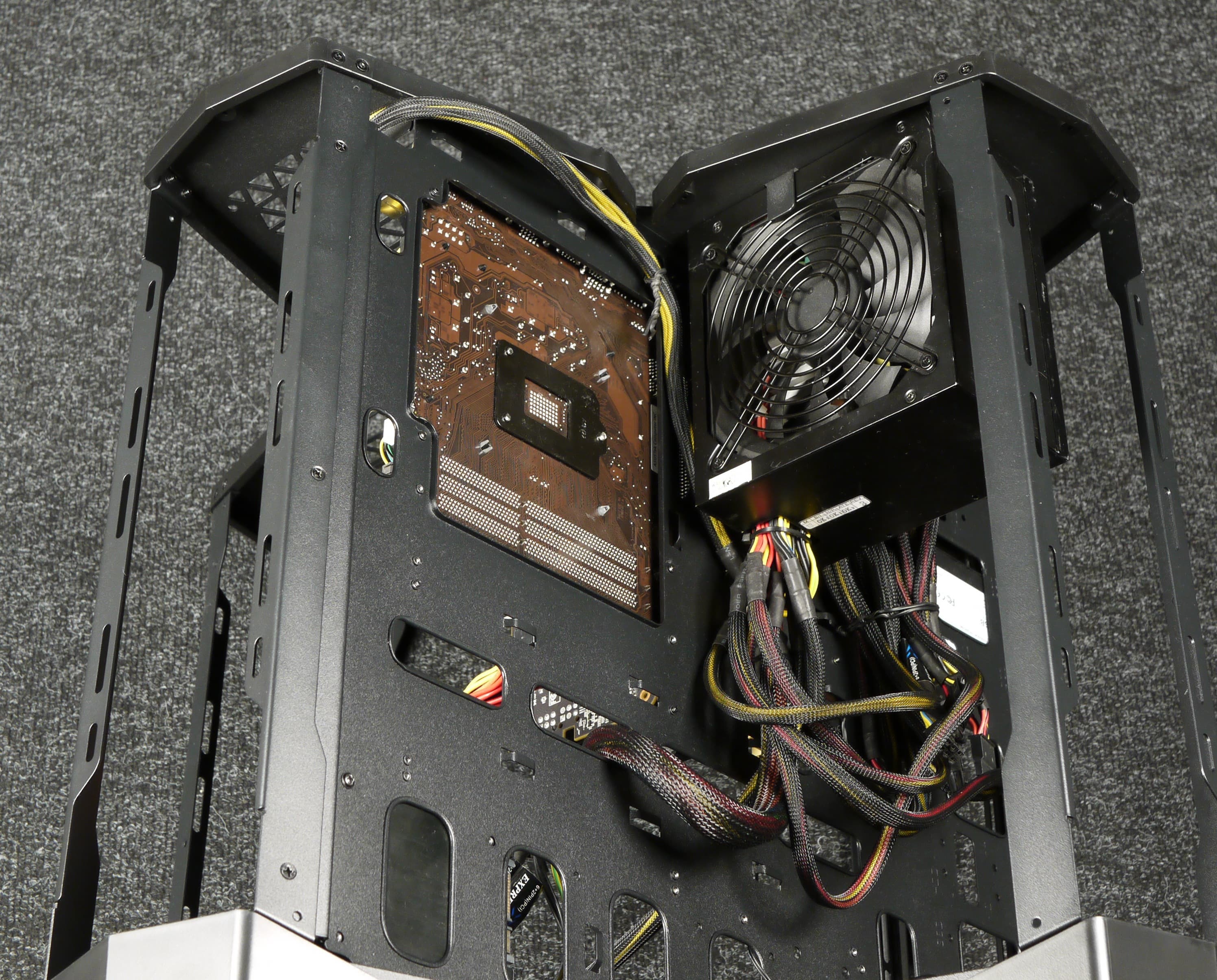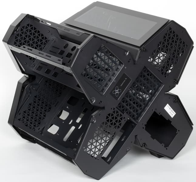 Компоновка безусловно весьма оригинальная, но в реальности у корпуса не четыре отдельные секции, а единое внутреннее пространство, рассеченное пополам материнской платой. Системная плата при установке наклонена на 45 градусов относительно опорной поверхности, на которой устанавливается корпус. Остальные компоненты внутри также наклонены на эти 45 градусов, что может несколько усложнить различные монтажно-демонтажные мероприятия.