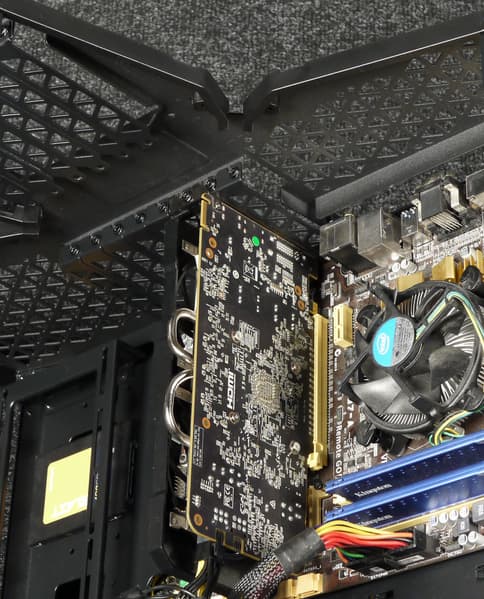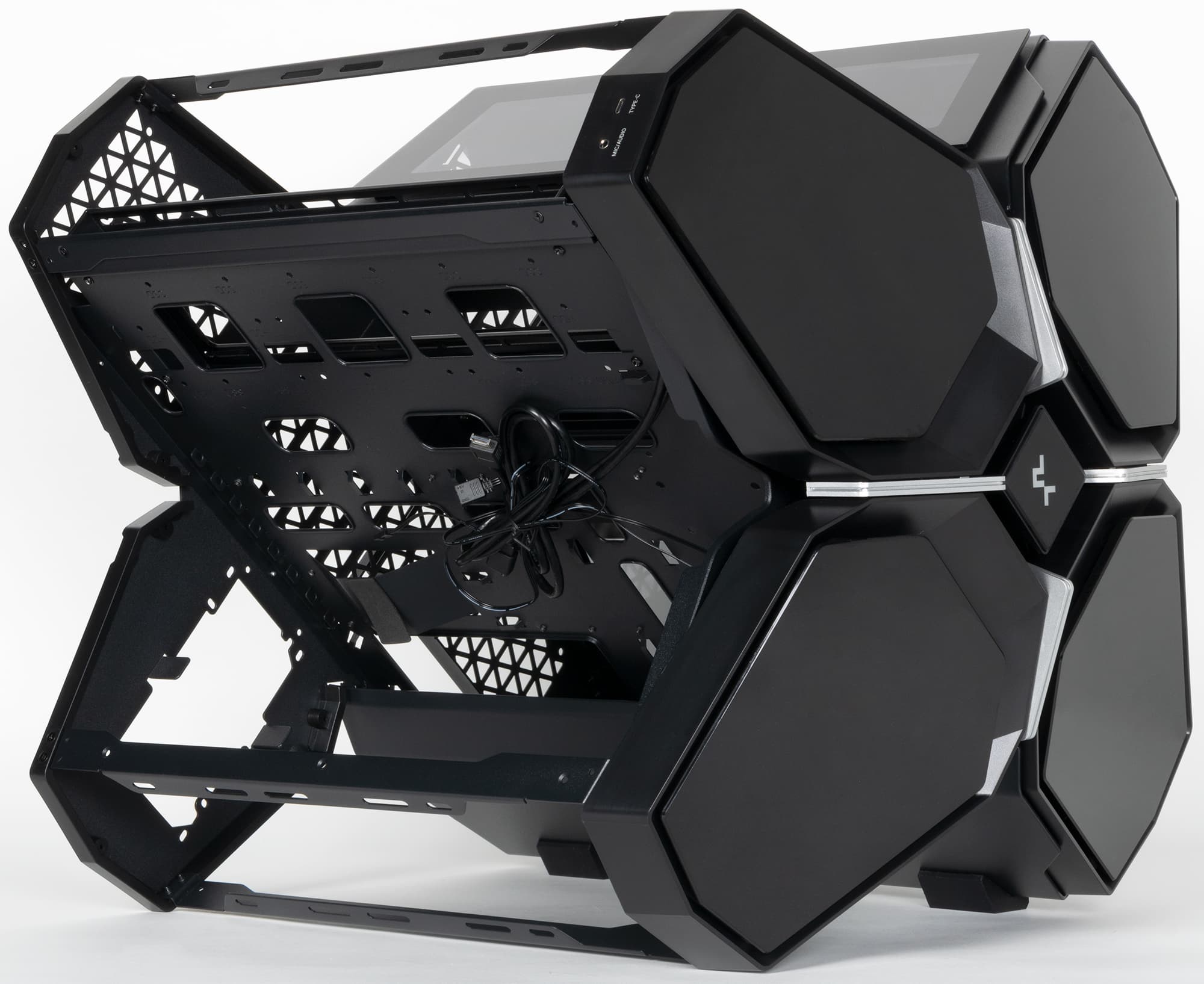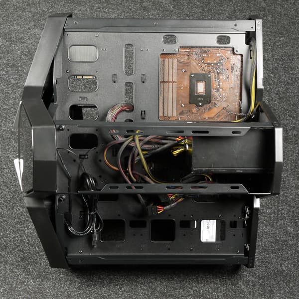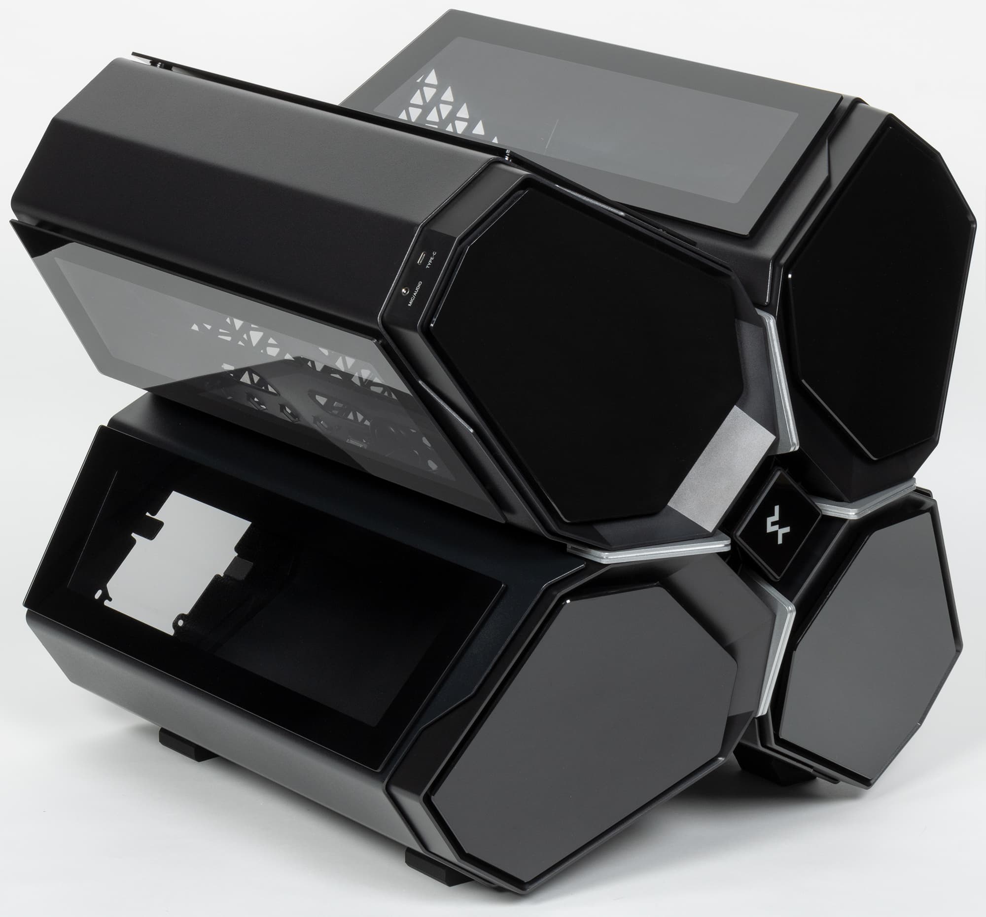 Компоновка безусловно весьма оригинальная, но в реальности у корпуса не четыре отдельные секции, а единое внутреннее пространство, рассеченное пополам материнской платой. Системная плата при установке наклонена на 45 градусов относительно опорной поверхности, на которой устанавливается корпус. Остальные компоненты внутри также наклонены на эти 45 градусов, что может несколько усложнить различные монтажно-демонтажные мероприятия.