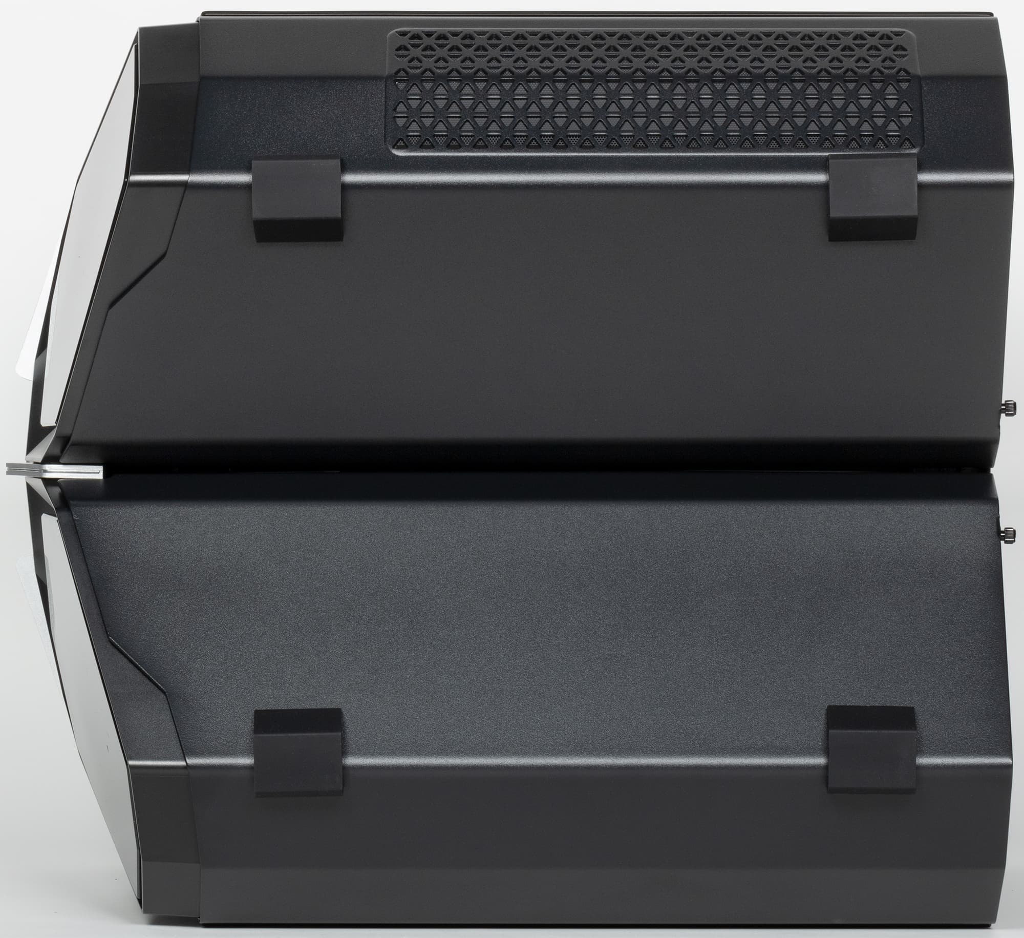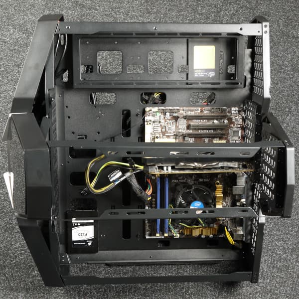 Особенность корпуса заключается в том, что с него можно снять только две верхние стенки, а чтобы снять оставшиеся, корпус нужно перевернуть. Делается это легко, корпус симметричный, его довольно удобно перекатывать с бока на бок. По большому счету, он может стоять во всех четырех возможных положениях, в том числе если снять с него стенки. Кстати, подобный вариант использования корпуса, хотя и не заявлен производителем, вполне имеет право на жизнь, так как получится не просто оригинально выглядящий открытый стенд, но и удобный в эксплуатации.