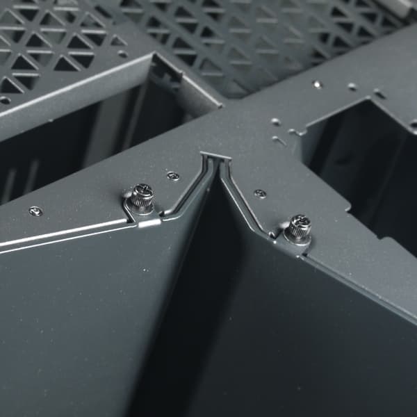 С корпуса можно демонтировать семь деталей: четыре боковые стенки, два адаптера для радиаторов и разделительную пластину, которая располагается над системной платой. Крепление всех деталей выполнено на винтах, их открутить придется довольно много, но в больших корпусах это частое явление, даже если у них более типовая конструкция. И это действительно не слишком удобно для сборщика.