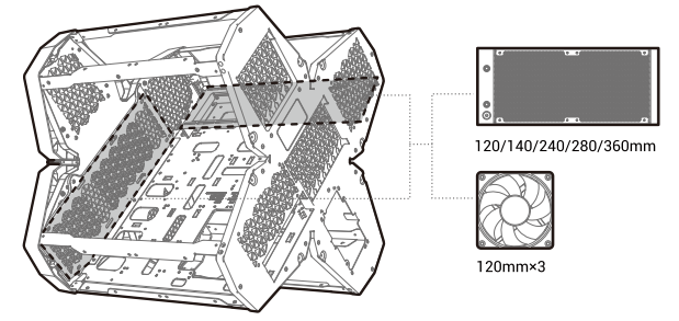 Для радиаторов есть два посадочных места длиной 360 мм: одно — на съемной рамке внутри корпуса в нижней части лицевой стороны основания для системной платы, второе — на съемной пластине на передней стенке шасси.