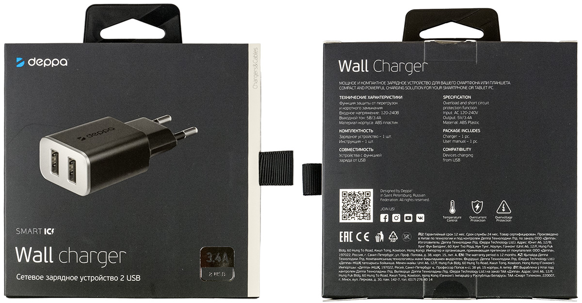 Все они упакованы в картонные коробки-книжки с единым оригинальным оформлением, оснащенные европодвесом. У коробок есть откидная крышка, которая удерживается магнитами, а для удобства ее открывания имеется петелька из ткани. Под этой крышкой скрывается окно, через которое можно увидеть и само ЗУ, и входящий в комплект кабель (если он есть). На тыльной стороне упаковки на английском и русском языках приведены краткие параметры устройства. На коробках имеется символ технологии Deppa Smart IC, но подробности не раскрываются, в том числе и на официальном сайте. Сказано лишь, что данная технология быстрой зарядки «позволит сократить время заряда подключаемого устройства», и приведены примеры: смартфон, который от обычного порта USB 2.0 заряжается за 5 часов, и планшет, для заряда которого в тех же условиях требуется 8 часов, от ЗУ с Deppa Smart IC зарядятся за 2,5 и 4,5 часа соответственно. На всех упаковках нанесены символы защиты Temperature Control, Overcurrent Protection и Overvoltage Protection.