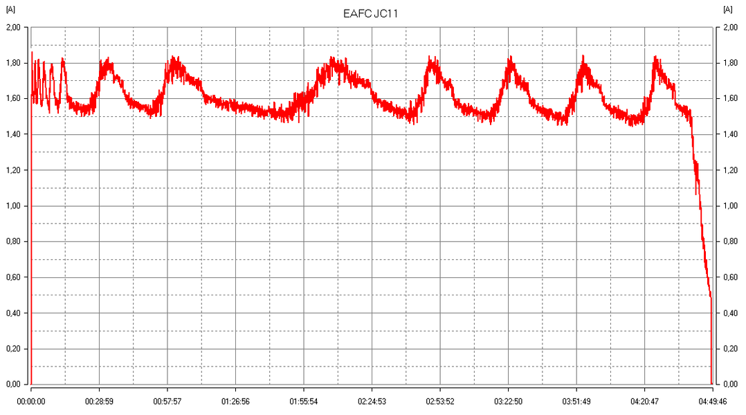 После подключения к зарядному устройству потребляемый ток всё же не был существенным: в течение 8-9 минут он не превышал 0,33 А, лишь потом повысился до 1,5-1,8 А. То есть рекомендация поначалу заряжать сильно разряженные литий-ионные аккумуляторы малым током всё же выполняется и в EAFC JC11.