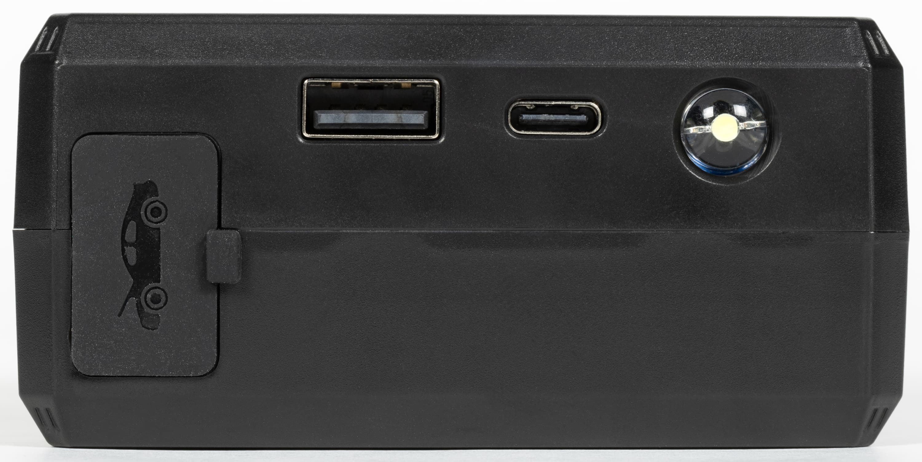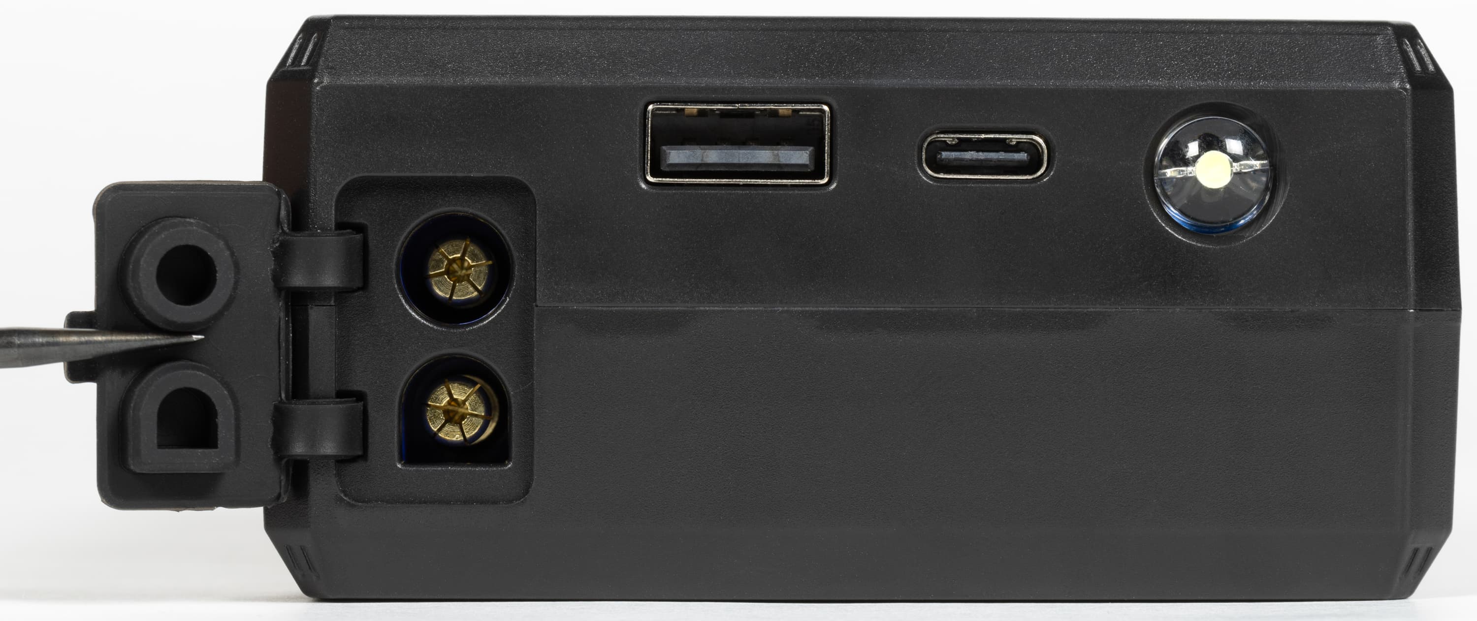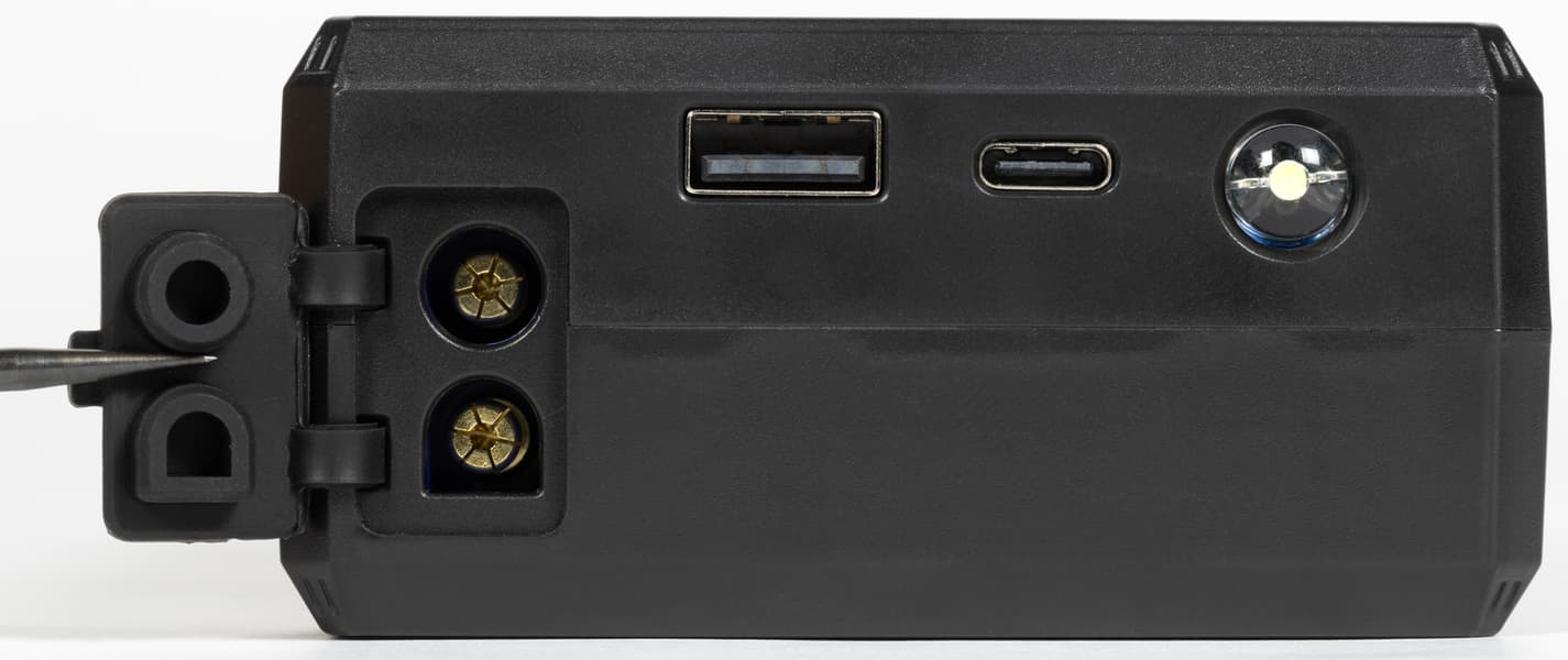На одном из коротких торцов расположены различные разъемы — двухконтактная розетка силового выхода, прикрытая резиновой заглушкой, а также выход USB-A и вход USB-C, там же находится очень яркий белый светодиод фонарика.