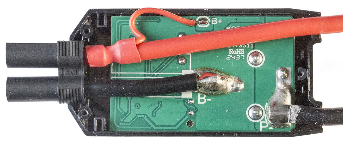 К бустеру контроллер подключается разъемом, аналогичным Amass EC5 (черного цвета, а обычно такие продукты Amass Electronics синие, поэтому есть некоторое сомнение в аутентичности).