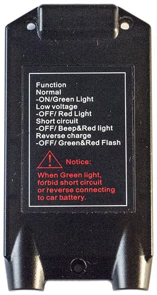 На тыльной стороне контроллера есть надписи, призванные пояснить индикацию, но некоторые из них противоречат наблюдаемому: перемигивание красного и зеленого происходит не при обратной полярности подключения, а вообще без соединения с какой-либо нагрузкой. Предупреждение красными буквами о недопустимости короткого замыкания или обратного подключения при горящем зеленом светодиоде тоже вызывает вопросы: такая индикация у нас появлялась при работе с подключением к АКБ, пусть и сильно разряженной, и если умудриться устроить КЗ при этом можно, то как вдруг может оказаться перепутанной полярность, которая только что была нормальной, это загадка. Вероятно, понимать надо так: зеленый светодиод означает подачу напряжения с 12-вольтового выхода бустера на зажимы, и если до подключения в бортсеть он всё же загорелся (у нас такого не наблюдалось, но мало ли что), тогда надо быть очень осторожным и внимательным.