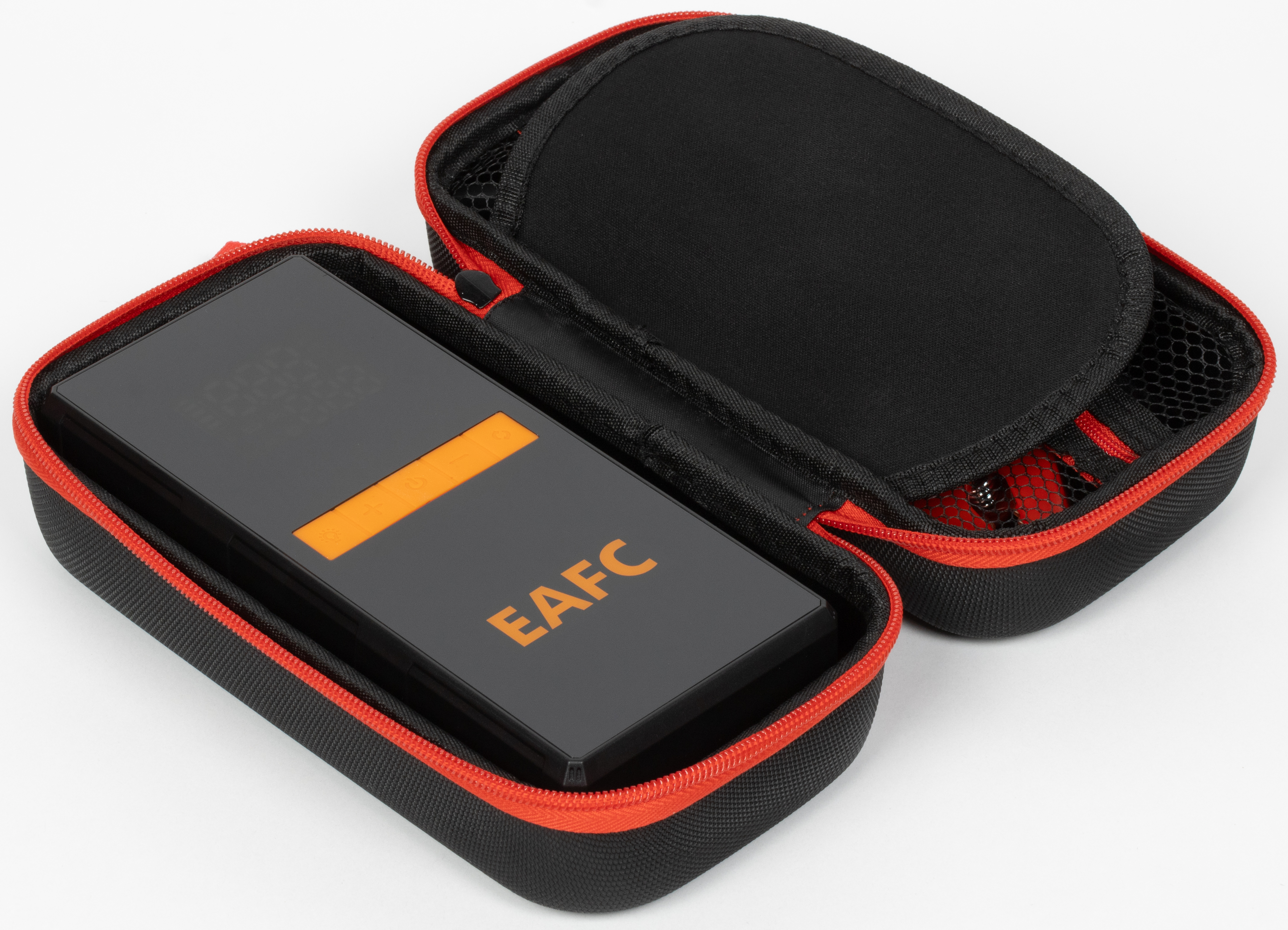 Чехол-кейс прочный и очень удобный, закрывается на молнию. В нем два разделенных вшитым вкладышем отсека: один под сам бустер, второй под прочие аксессуары (с сеточкой на молнии, чтоб они не рассыпались). Снаружи предусмотрена петля, за которую удобно брать рукой, ее можно использовать и для подвеса. Настоятельно рекомендуем не экономить и заказывать комплект с таким кейсом; у рассмотренного нами ранее Baseus BS-CH003 был гораздо менее практичный чехол-кисет — мягкий матерчатый мешочек с завязкой, в котором комплект помещался с трудом, на сайте eafccar.com для бустера JC11 вместо кейса изображен такой же кисет.