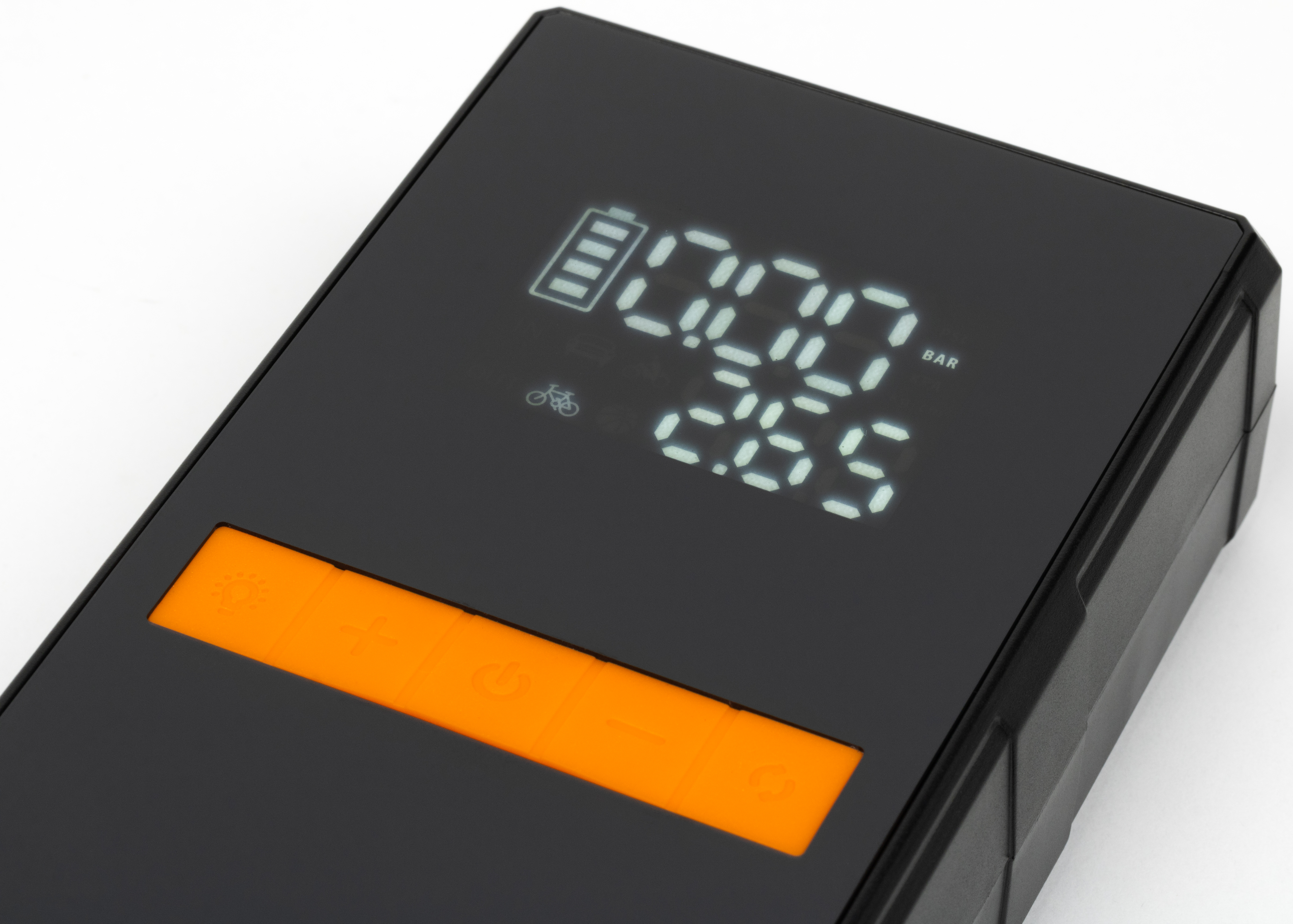 На индикаторе отображаются: два значения давления — крупными цифрами текущее (три знака, сразу после включения здесь нули) и цифрами поменьше верхний предел для накачивания (тоже три знака), а также выбранная долгими нажатиями правой кнопки единица измерения: psi, бар, кПа, кг/см². Кроме того, имеются индикатор уровня заряда и служебные символы: автомобиль, мотоцикл, велосипед и мяч — это набор предустановок верхнего предела, нужная выбирается короткими нажатиями правой кнопки, а сам лимит задается кнопками с символами плюса и минуса, установленное значение запоминается, для следующего колеса снова задавать его не придется.