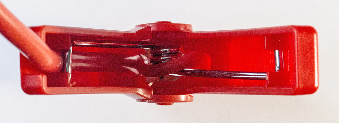 Зажимы обычные для подобных изделий, металлические контакты у них красно-желтого цвета, но это не чистая медь и не латунь: магнит к ним прилипает — возможно, использована омедненная сталь или некий сплав с большим содержанием железа.