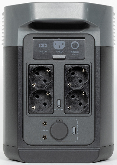 Противоположную стенку занимают две группы выходов, одна содержит четыре розетки Schuko с защитными шторками для подключения устройств с питанием от 230 В переменного тока (для регионов с другими стандартами предусмотрены соответствующие варианты), вторая 12-вольтовая DC — закрытое резиновой пробкой гнездо прикуривателя (инструкция называет его автомобильным зарядным устройством) и два штырьковых выхода DC5521. Каждая группа подключается-отключается собственной кнопкой со встроенным индикатором.