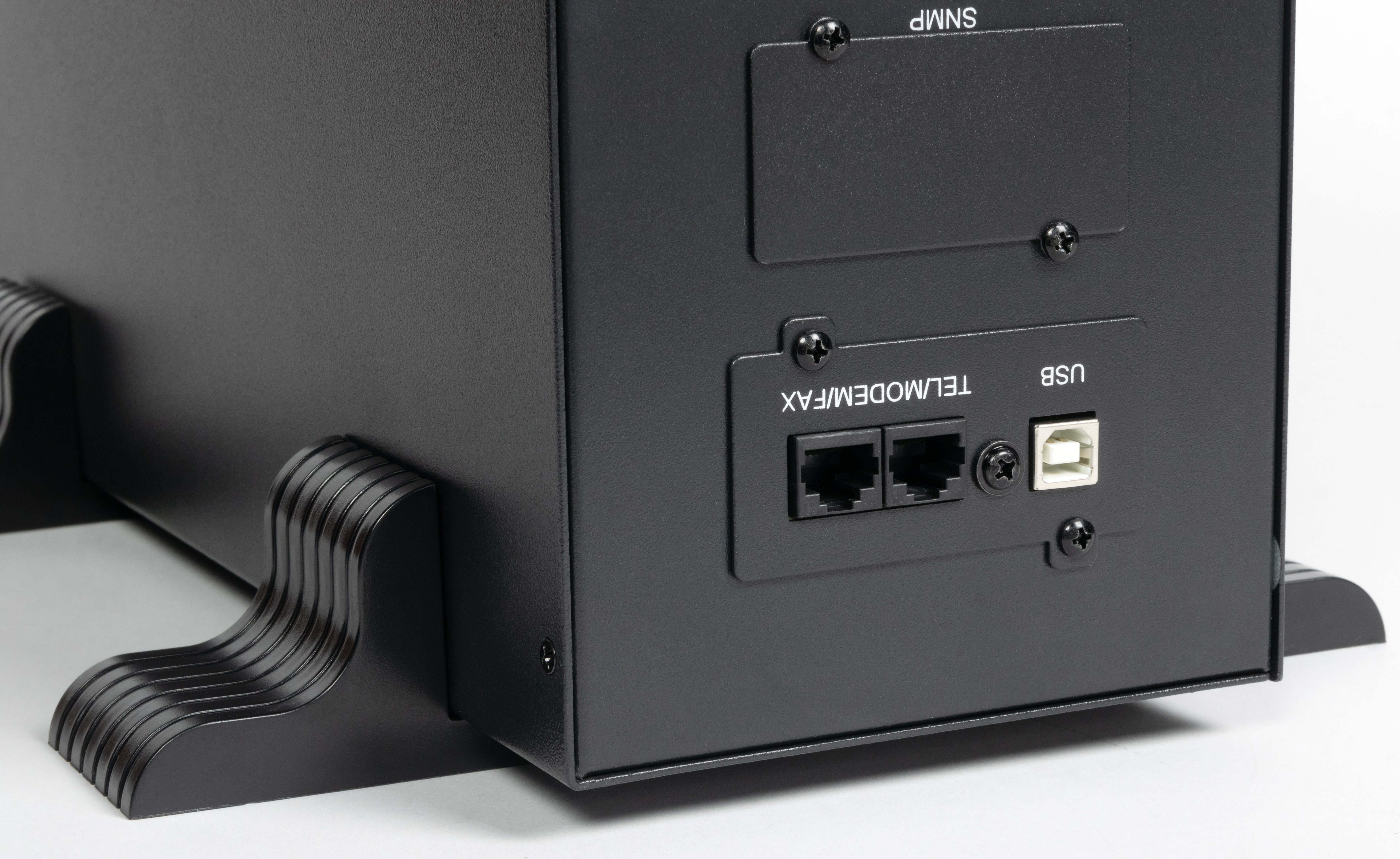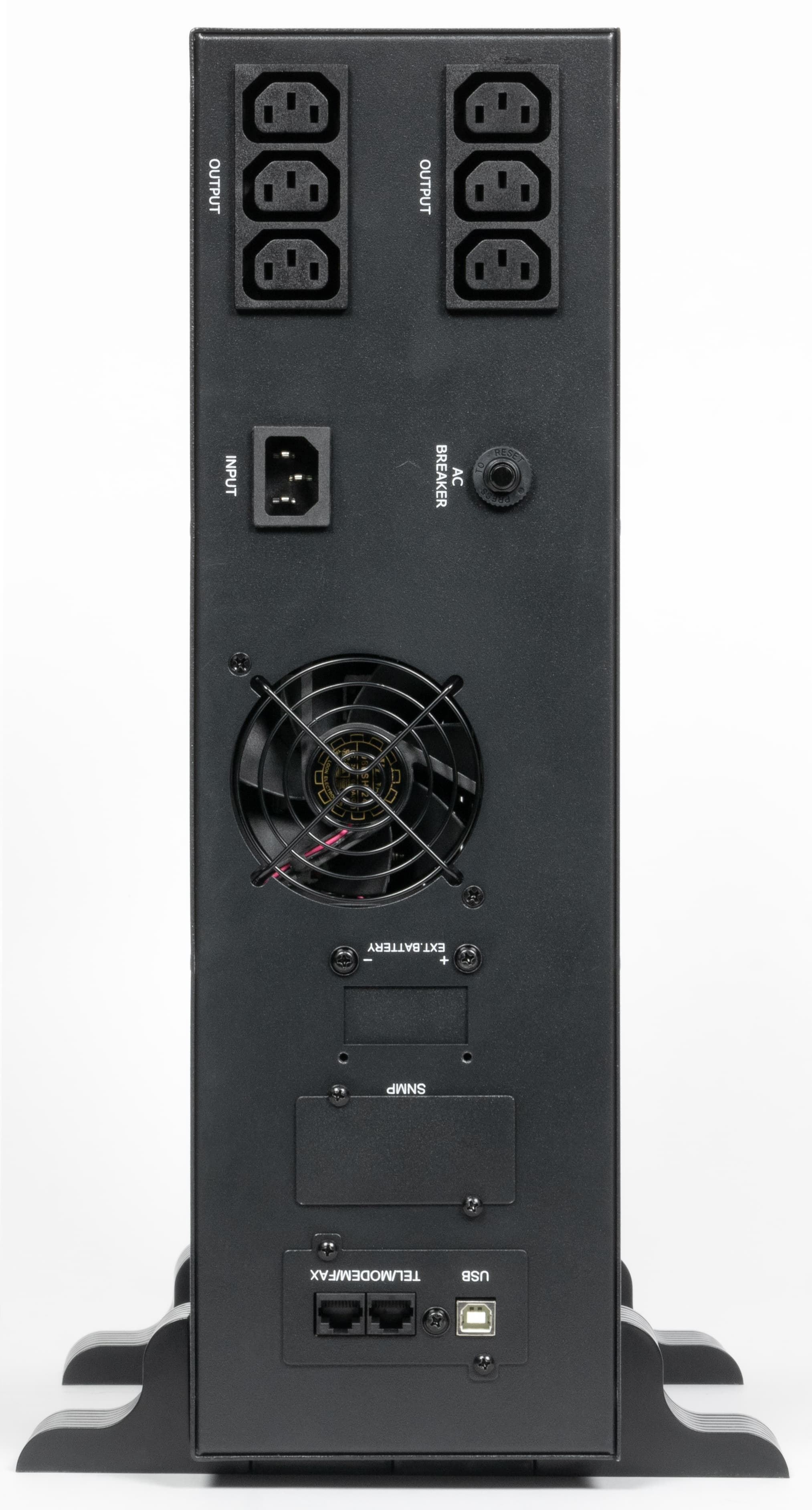 На задней стенке находятся две группы по три выходных розетки C13 (IEC 60320, все они соединены параллельно и обеспечены питанием от батареи), входной разъем С14, шток автоматического предохранителя, снабженное металлической сеткой отверстие для вентилятора, закрытые заглушками проемы для SNMP-адаптера и контактов для внешней батареи (они имеются в других моделях), пара разъемов 8P8C (RJ-45) для защиты коммуникационных линий и порт USB-A для связи с компьютером.