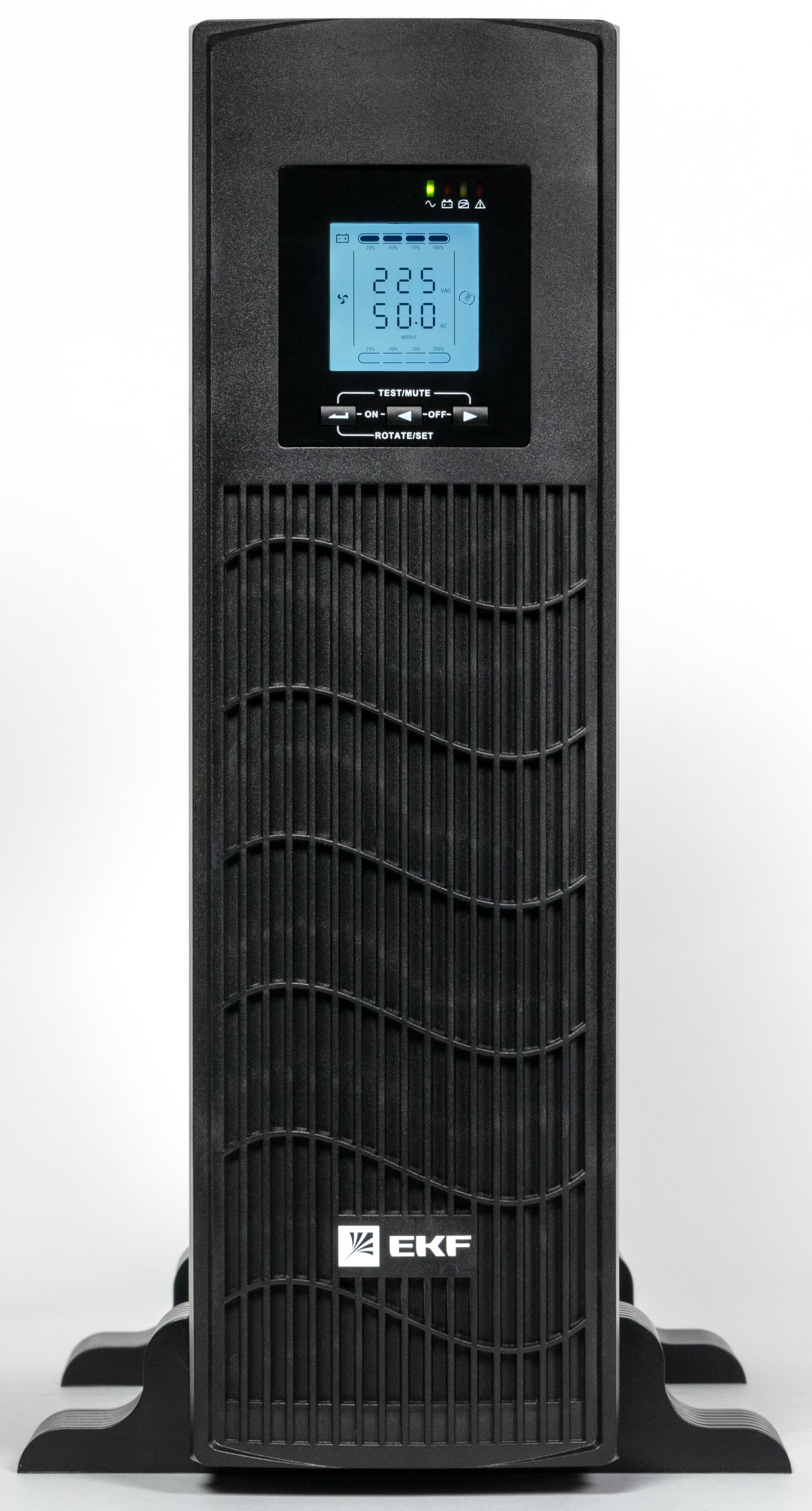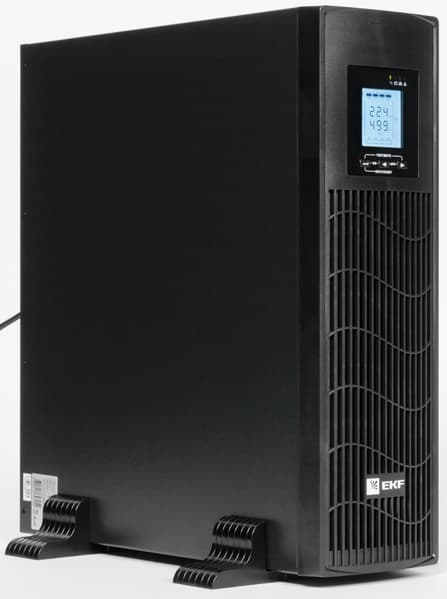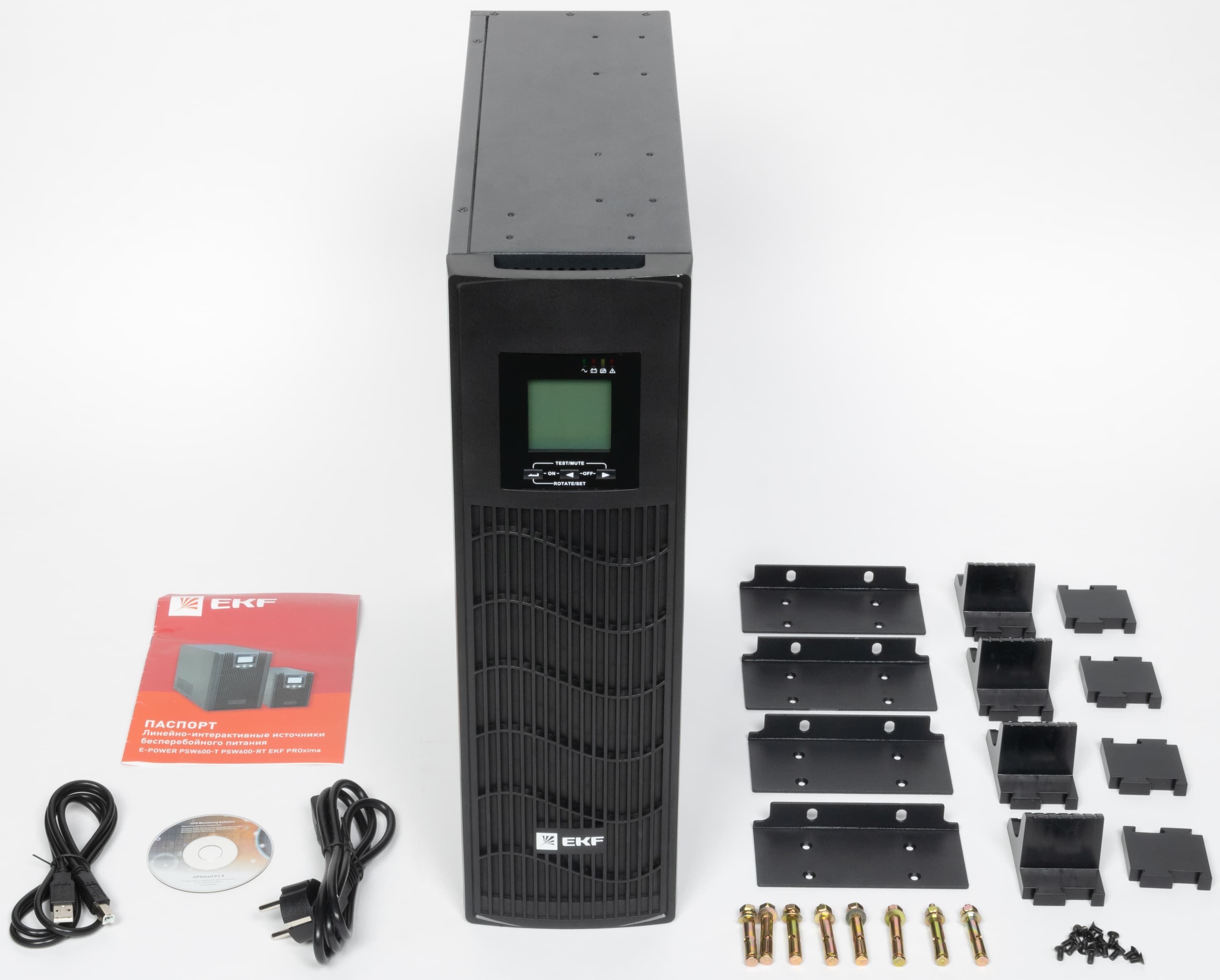 Источник бесперебойного питания EKF E-Power PSW620-RTB — типичная модель «двойного назначения»: для напольной, настольной или установки в 19-дюймовую стойку, комплектация включает необходимые для обоих вариантов детали.