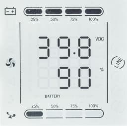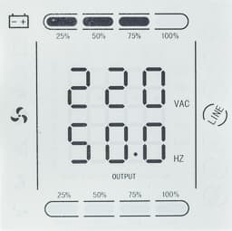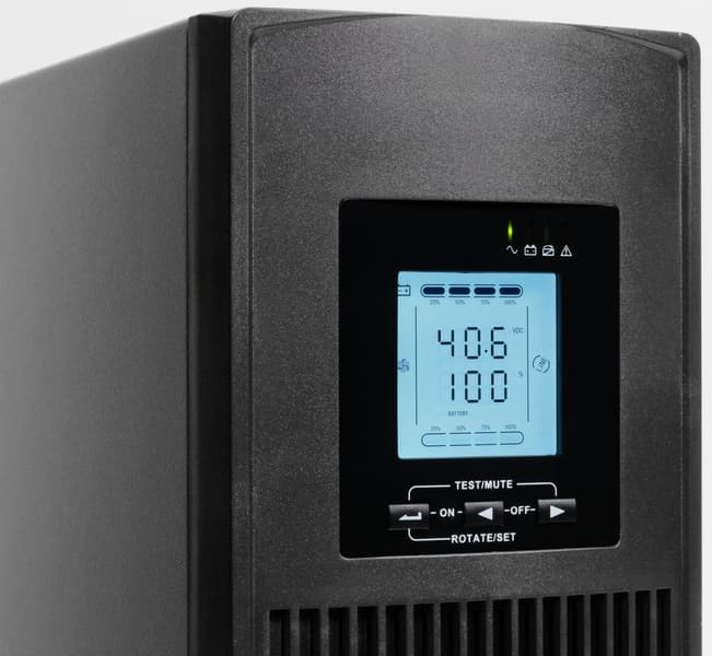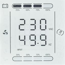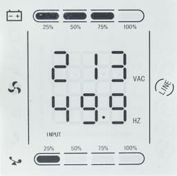 Над дисплеем расположены четыре светодиодных индикатора, зеленый левый отображает включение ИБП (при работе от сети или батареи), следующий красный — работу от батареи, третий (желтый) — режим байпаса или настройки, правый (красный) свидетельствует о проблеме, включая отсутствие внешней сети.