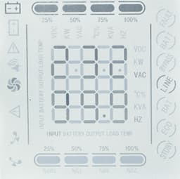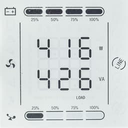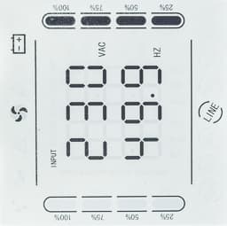 - слева и справа находятся символы, отображающие режимы и состояния: работа от сети (в режиме линейном или байпаса) или батареи, перегрузка, неисправность батареи, авария и другие;