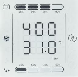 - двумя группами (одна над другой) по три крупных цифры — напряжение и частота на входе и выходе, мощность нагрузки в ваттах и вольт-амперах, температура внутри корпуса (плюс еще некий параметр, всегда равный 400), напряжение на батарее и процент остатка заряда;