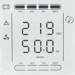 | Перегрузочная способность | при работе от сети: 110% — 120 с, 125% — 60 с, 150% — 10 с, затем переход на байпас при работе от батареи: 110% — 120 с, 125% — 10 с, 150% — 5 с, затем отключение |