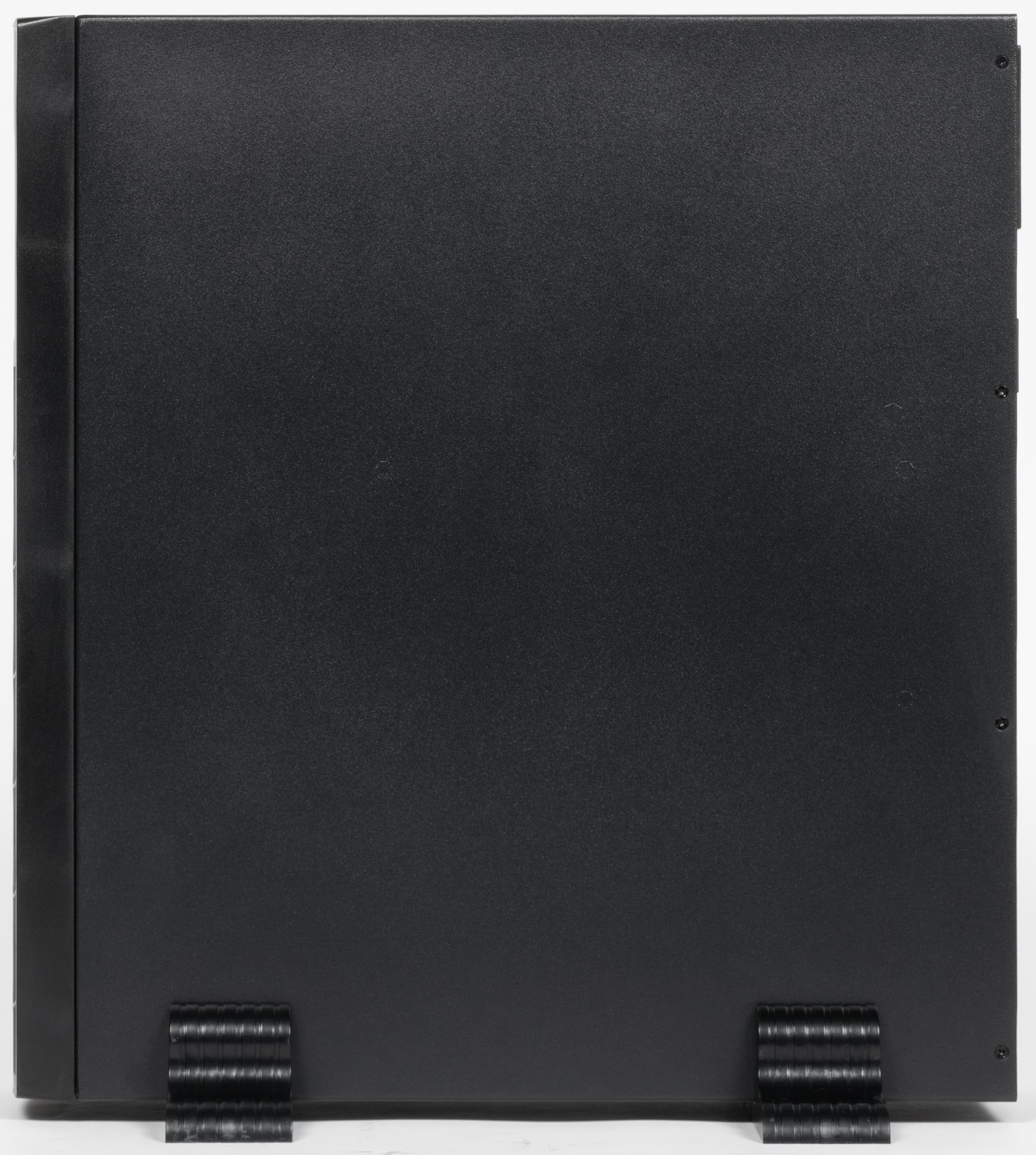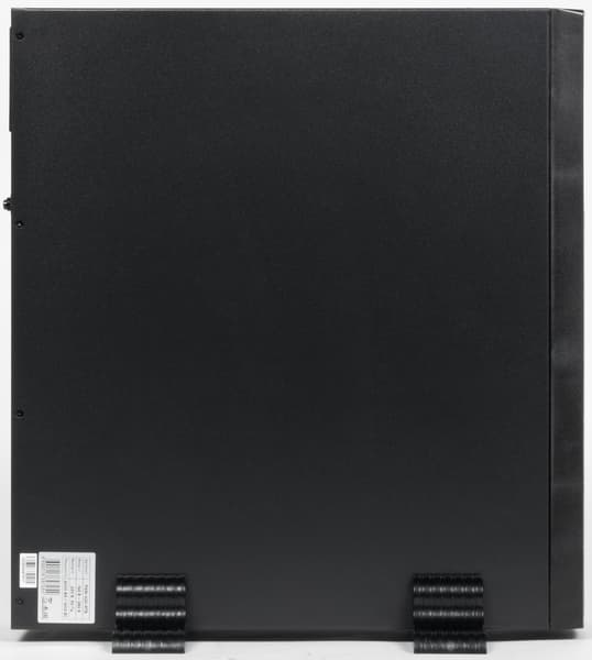 Корпус металлический, черного цвета. Фронтальная накладка пластиковая, в ее верхней (здесь и далее — при вертикальной установке ИБП, если не указано иное) части расположена панель управления, почти вся оставшаяся поверхность занята решеткой, через которую происходит подача воздуха для охлаждения.