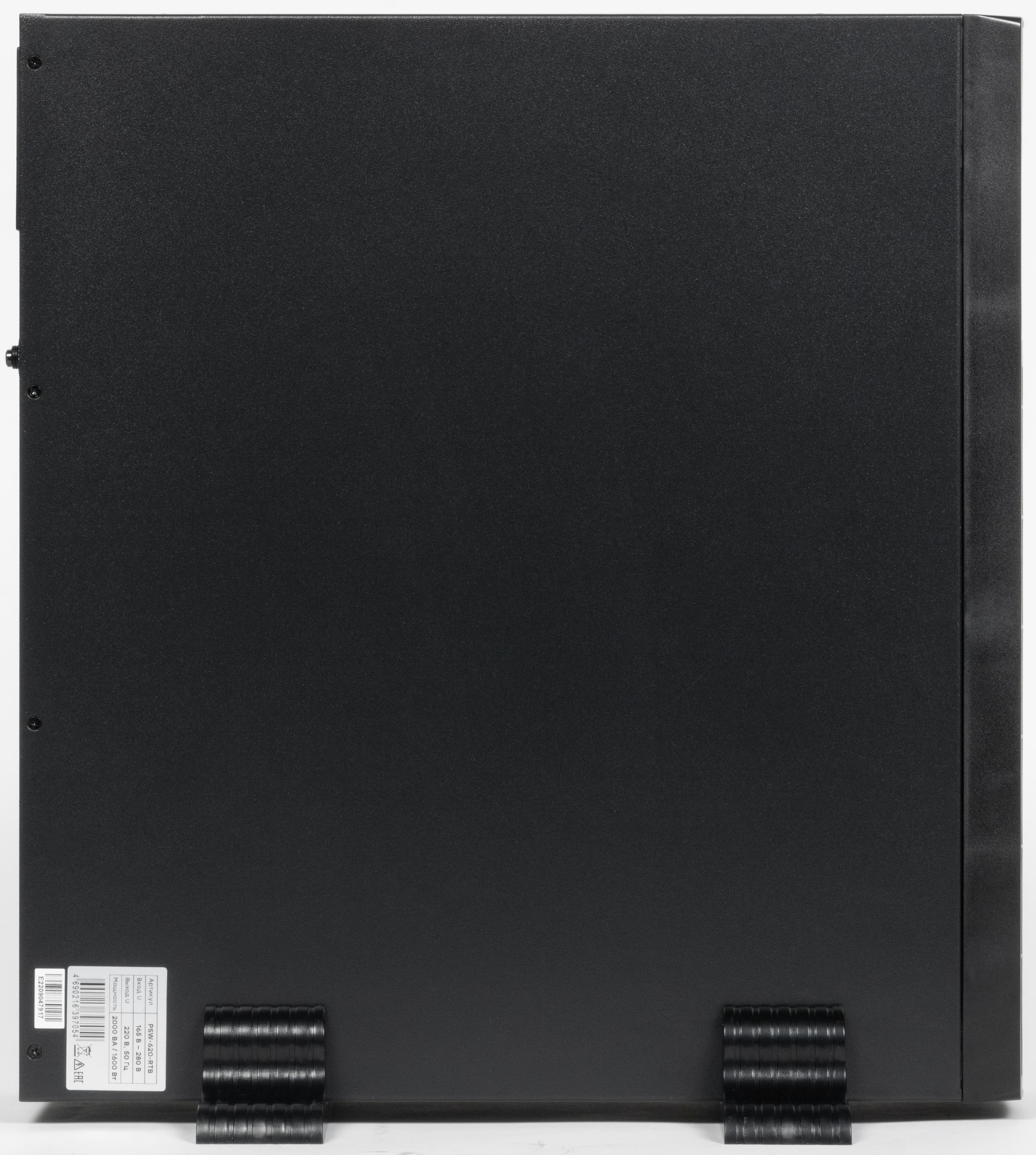 Заявленные характеристики, взятые из руководства пользователя и с сайта производителя, представлены в таблице. Причем в инструкции индексы моделей линейки PSW600 несколько иные, чем на официальном сайте: они включают указание на выходную мощность в вольт-амперах — ИБП на 500 В·А обозначается PSW605, на 3000 В·А — PSW630, а наш аппарат соответственно PSW620. Такое же обозначение содержит и наклейка на корпусе, причем с дополнительными буквами RTB, первые две означают исполнение в корпусе, предусматривающем как монтаж в стойку, так и отдельное размещение, последняя — встроенные батареи.