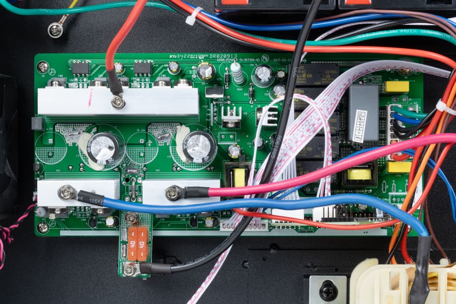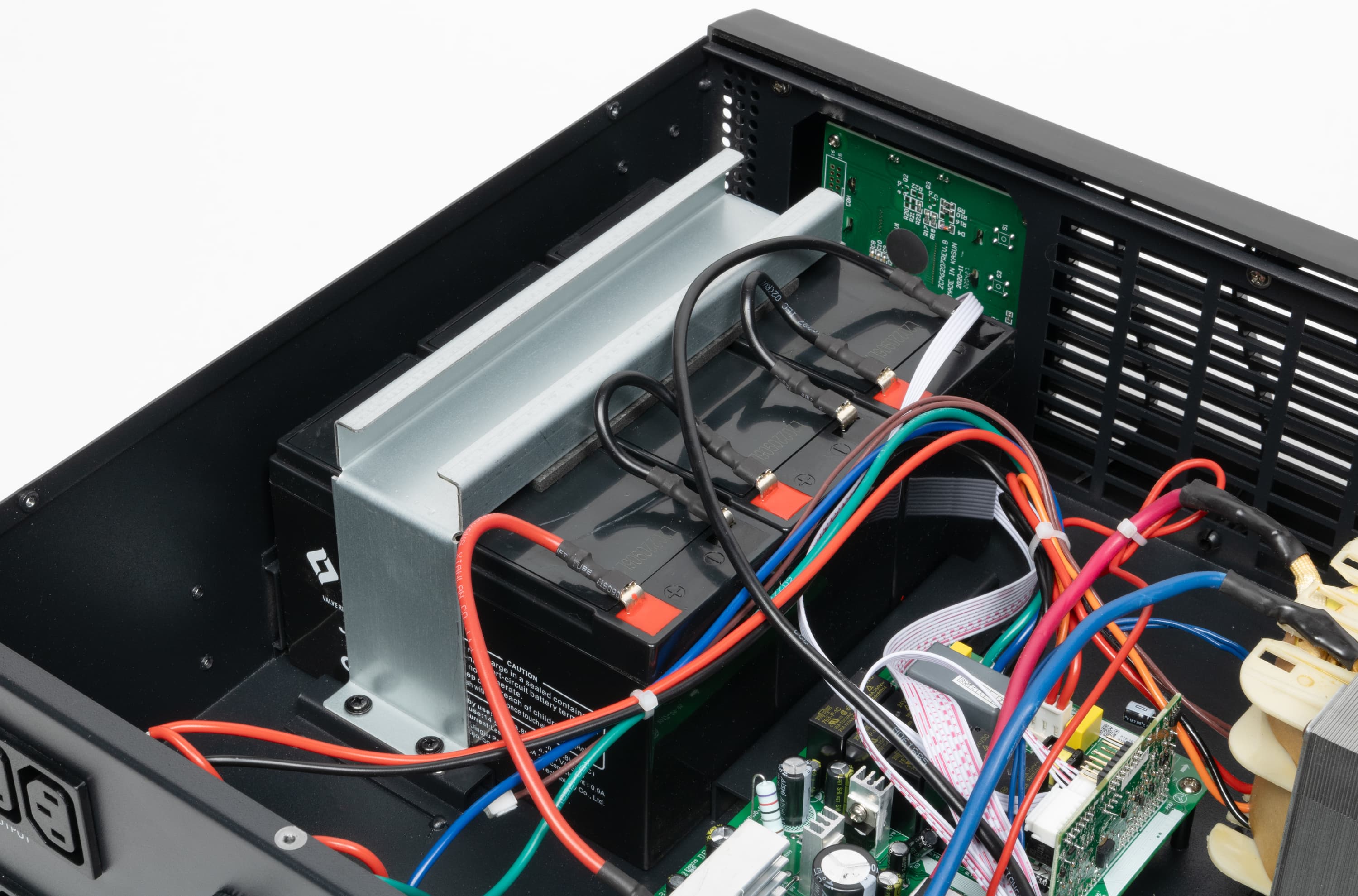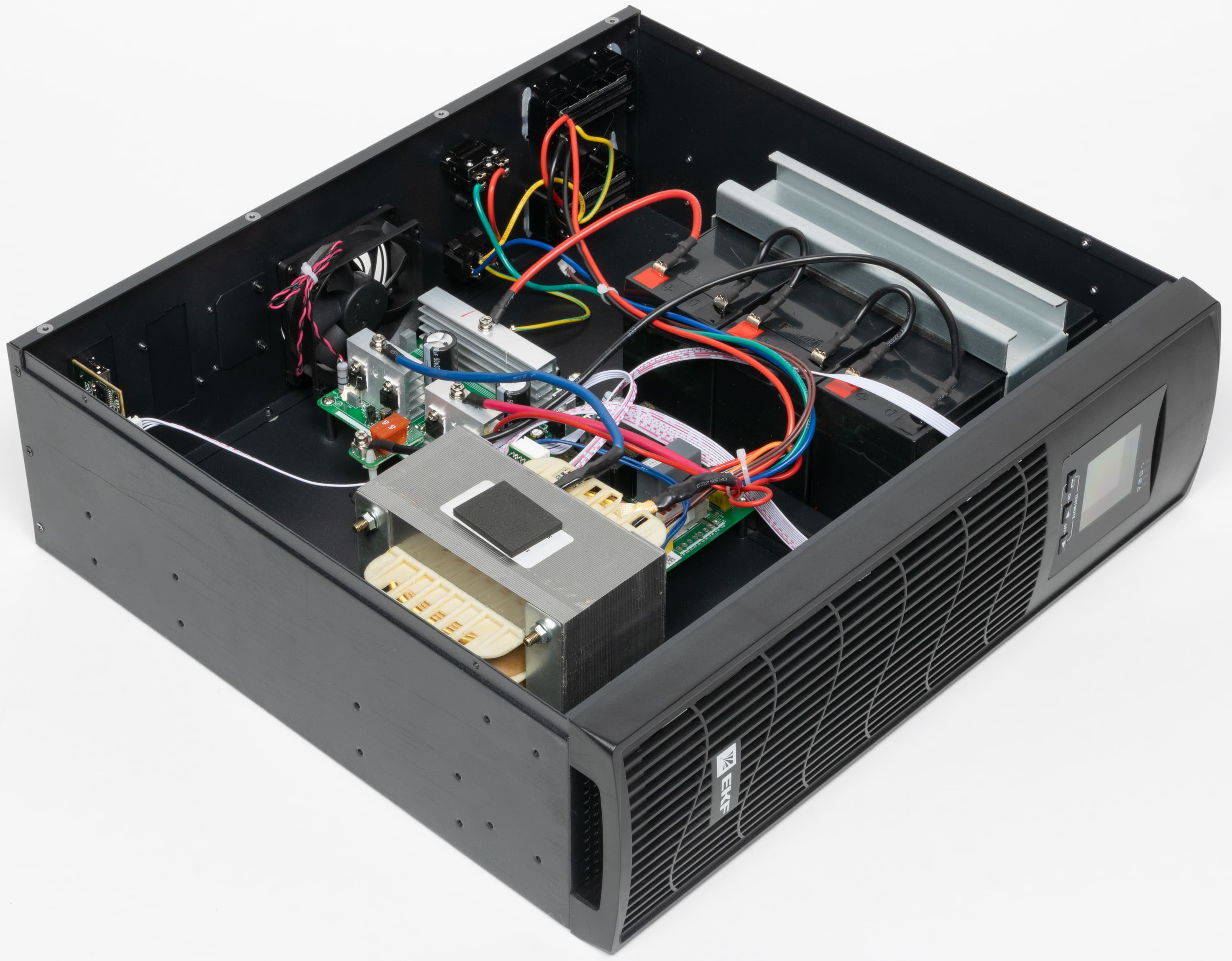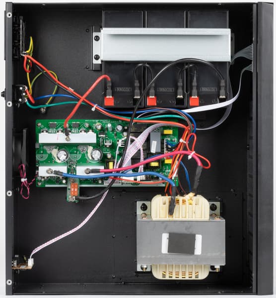 Внутри видим три последовательно включенных батареи, зафиксированных П-образным металлическим прижимом, большой трансформатор системы AVR с сердечником на Ш-образных пластинах, а также среднего размера плату с управляющей и силовой электроникой.