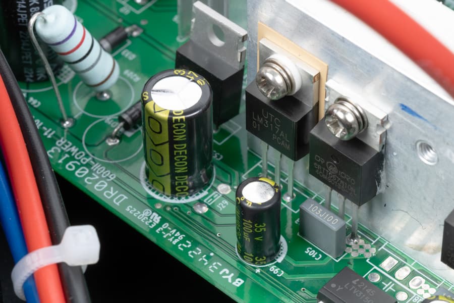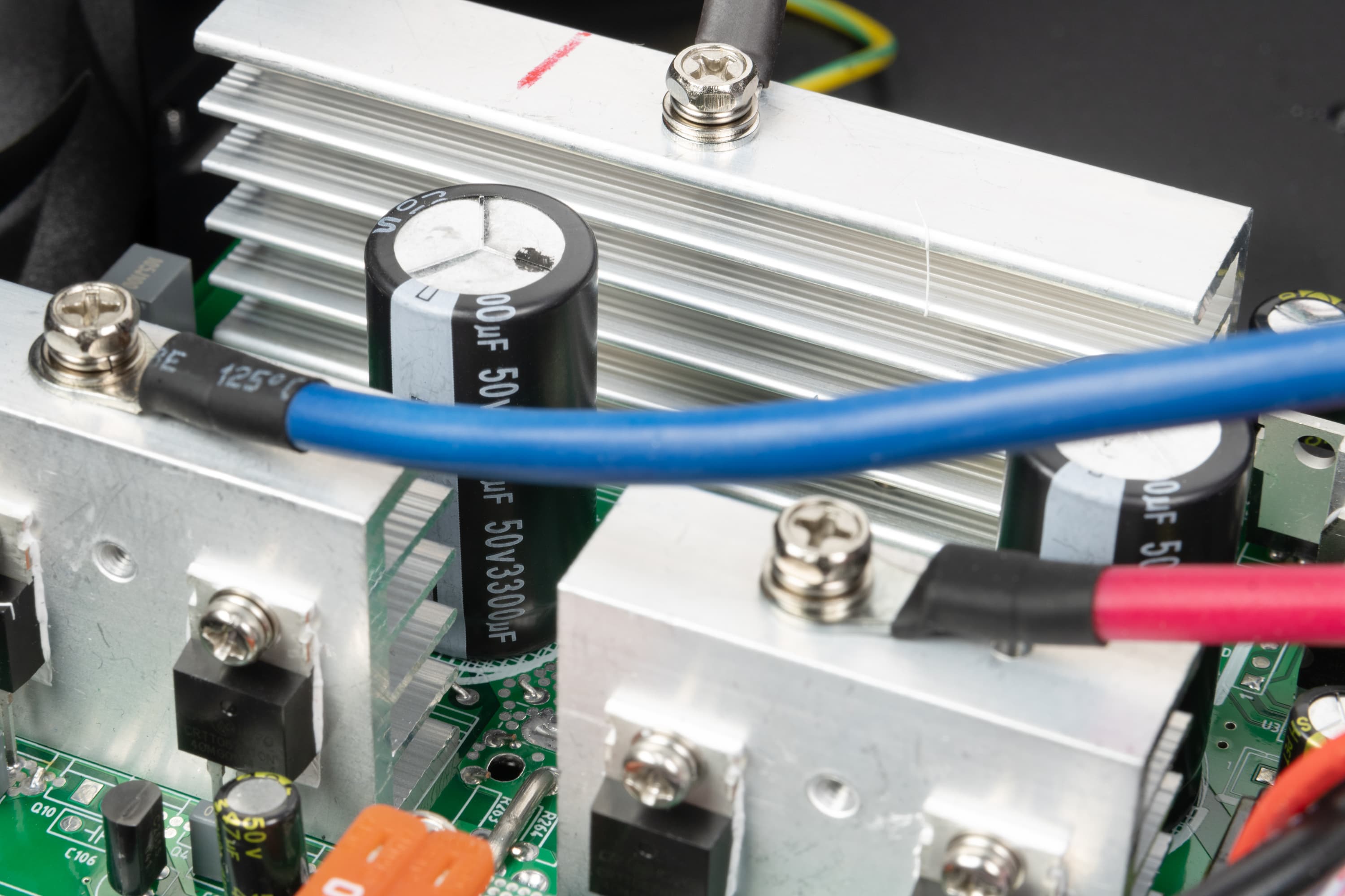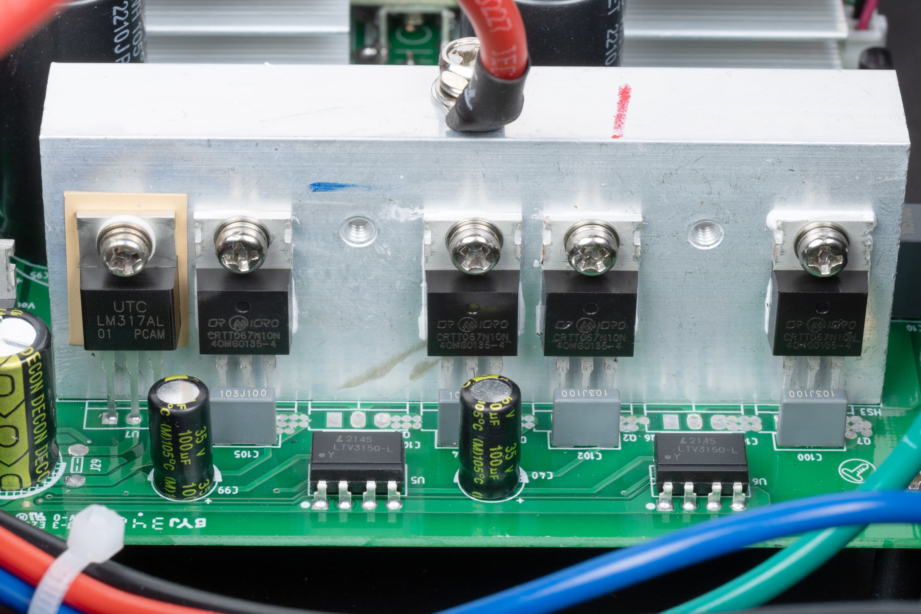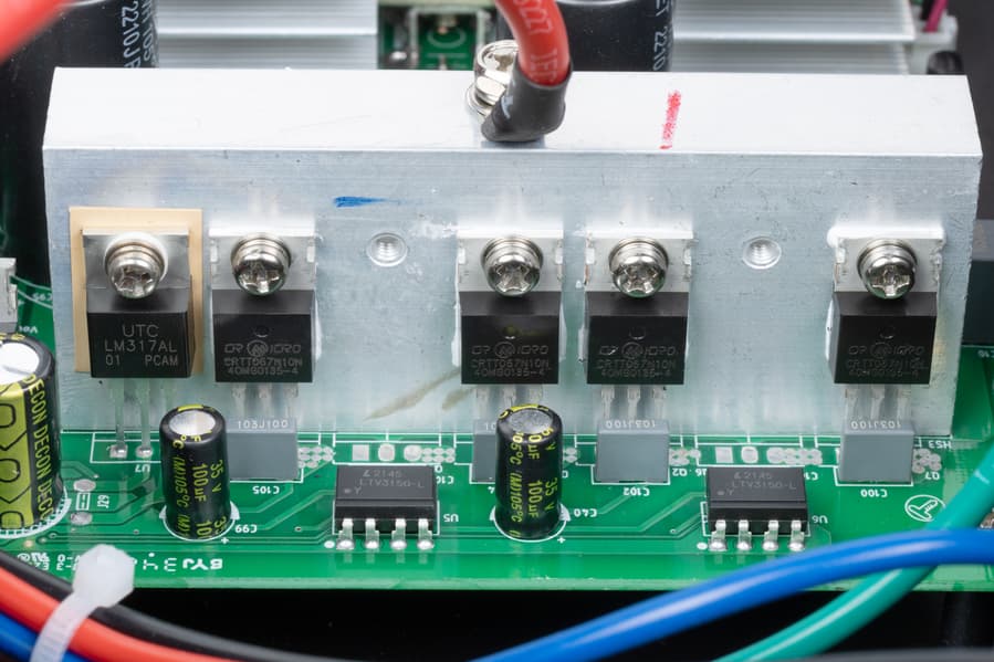 Набор силовых транзисторов закреплен на трех алюминиевых ребристых радиаторах, расположенных параллельно и повернутых ребрами друг к другу. Вентилятор (80×80×25 мм, 24 В / 0,19 А, вытяжной, работает постоянно, но имеет две скорости) обслуживает в основном эту зону, хотя главной «печкой» является трансформатор AVR — он нагревается постоянно и сильно.