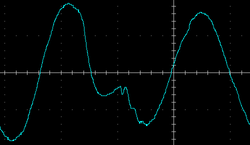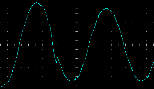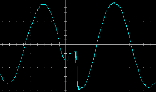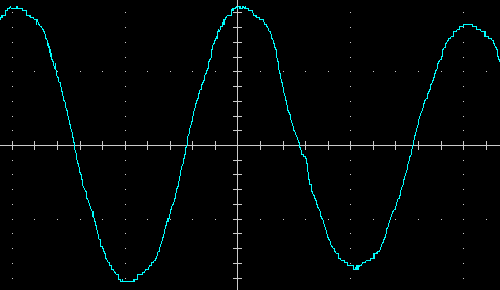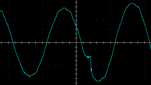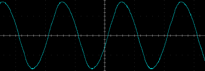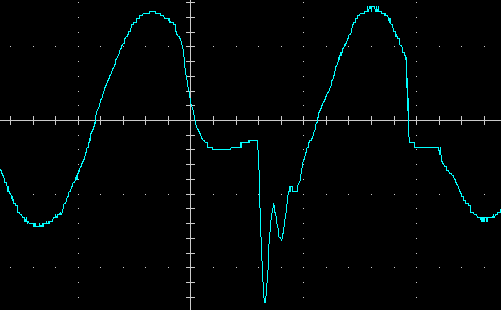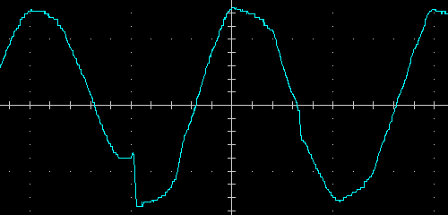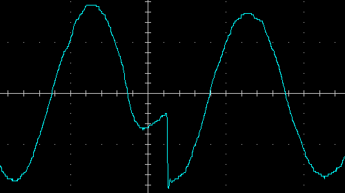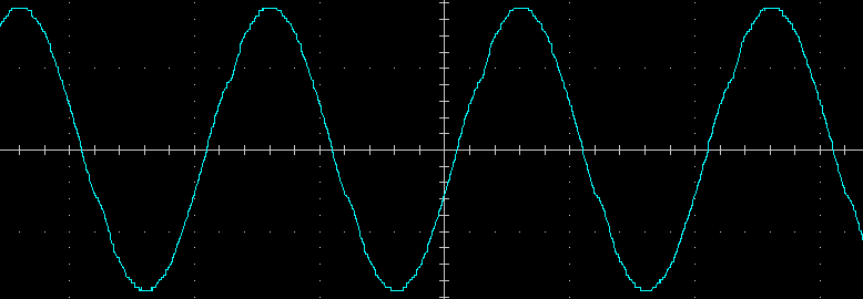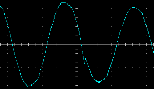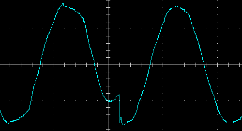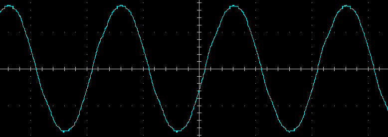 Выходное напряжение при работе от батареи — синусоида, вот ее внешний вид на холостом ходу и на чисто активной нагрузке 200 Вт, цена деления по горизонтали здесь и далее 5 мс: