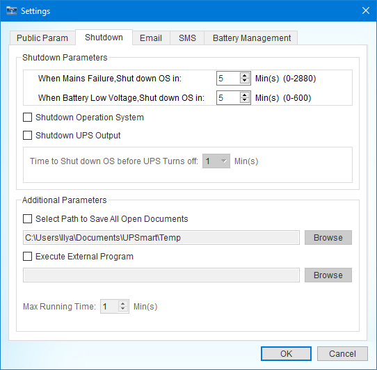 Вторая закладка позволит определить задержку до подачи команды на завершение работы операционной системы раздельно от момента возникновения неполадок во внешней сети (от 0, то есть сразу, до 2880 минут) и от достижения батареей уровня низкого заряда (от 0 до 600 минут). Поскольку программа не привязана к конкретной линейке ИБП, то диапазоны явно выбирались из самых общих соображений, а для PSW620 они вызывают удивление: 600 минут — это десять часов, столько эта модель не проработает автономно даже от полного заряда и на самую скромную нагрузку.