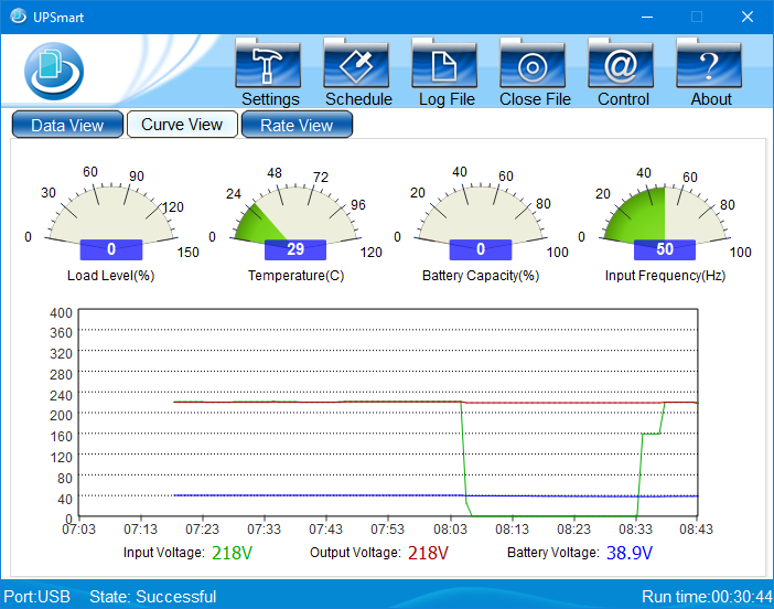 Работа от батарей при малых нагрузках: об этом было сказано выше, при описании настроек ИБП. Мы проверили, опробовав при установках по умолчанию автономную работу вообще без нагрузки — в течение 30 минут источник не отключился.