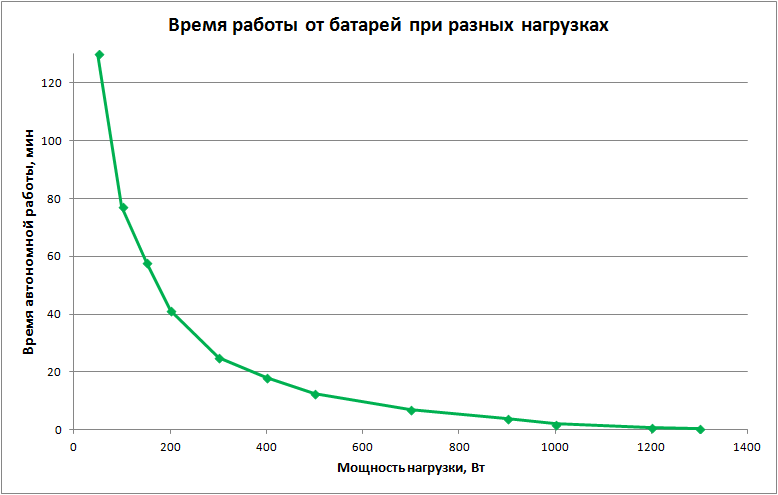 Замеры свыше 1300 ватт не проводились из-за отсутствия тарированных нагрузок соответствующей величины (по той же причине не исследовалась и перегрузочная способность), но уже понятно, что время работы с устройствами, суммарное потребление которых приближается к заявленному максимуму в 1600 Вт, будет исчисляться секундами, максимум десятком секунд, хотя в спецификации на сайте говорится о двух минутах автономной работы при полной нагрузке (в инструкции такого нет).