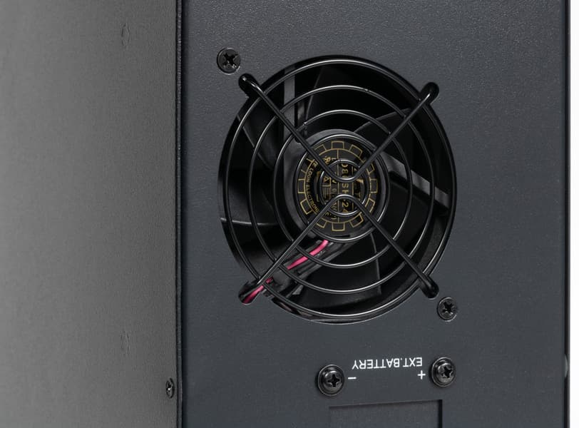 Основным источником шума, кроме звуковых сигналов и щелчков реле, является вентилятор. Скоростей вращения у него две, на меньшей он работает всегда, когда на входе ИБП есть напряжение, а на бо́льшую переходит при существенных нагрузках.