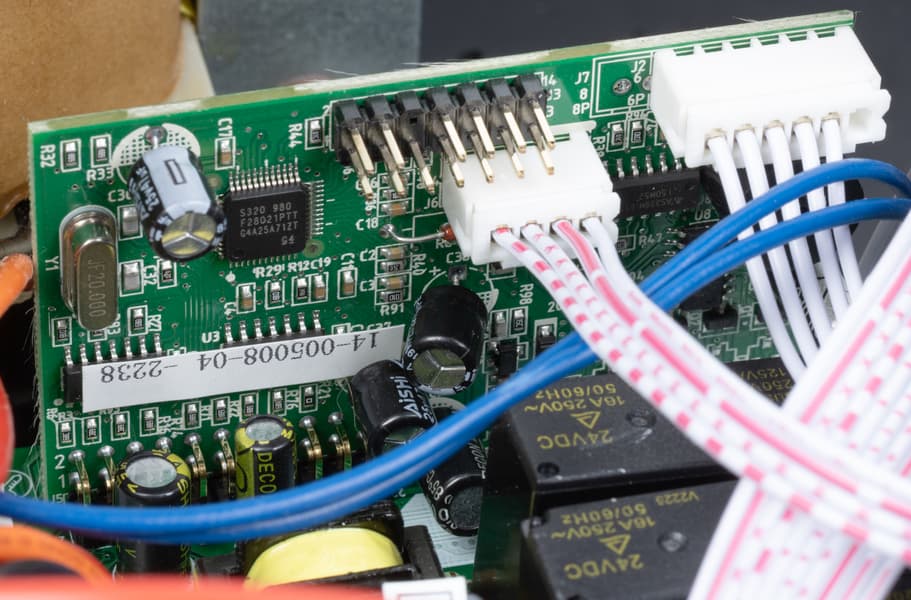 Еще одна небольшая плата содержит слаботочные разъемы USB-B и 8P8C (RJ-45), а также обслуживающие их электронные компоненты, она шлейфом соединяется с основной платой.