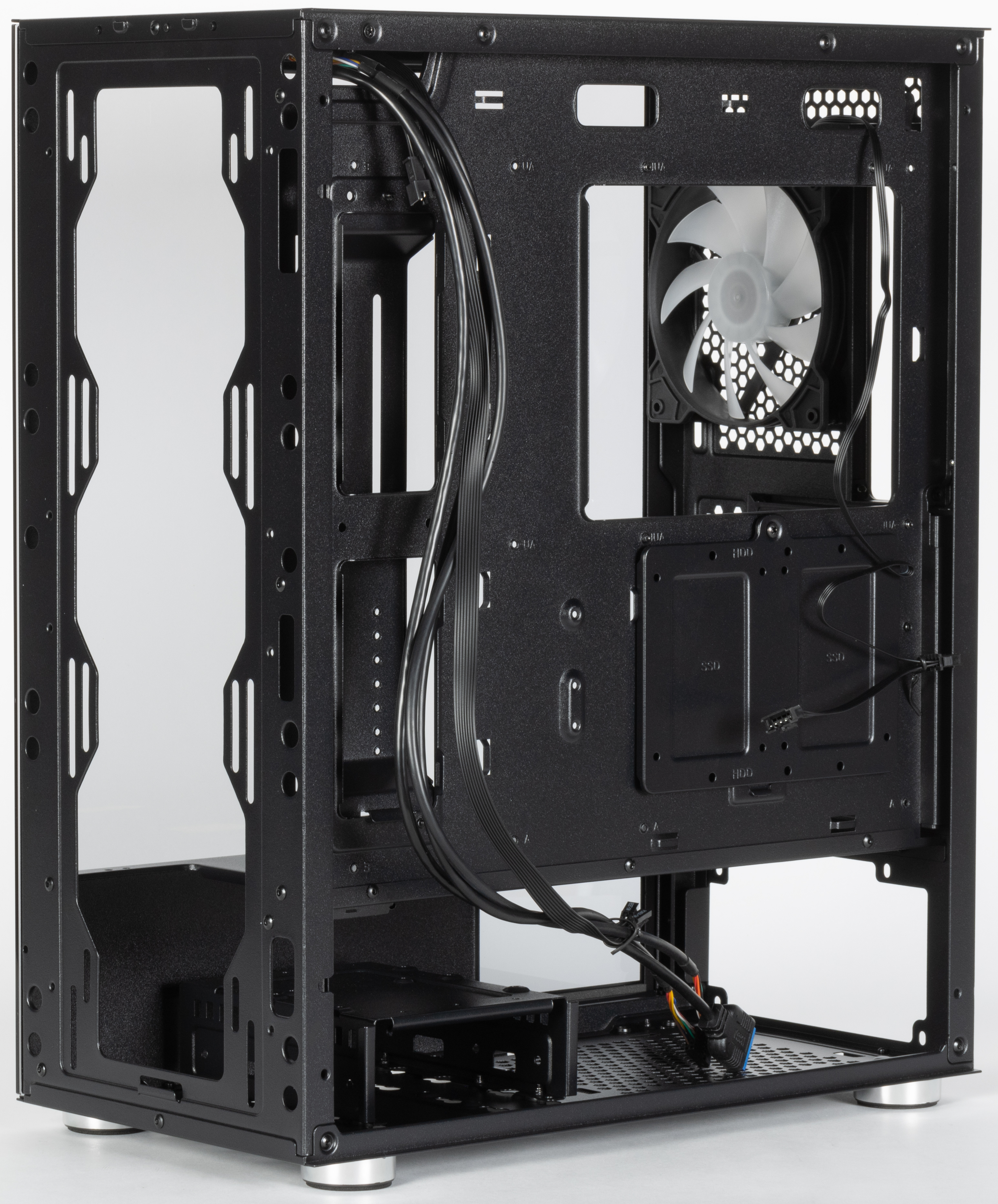 Предустановлен единственный 120-миллиметровый вентилятор с RGB-подсветкой, он находится сзади и работает как вытяжной. Как сказано чуть выше, он 4-контактным разъемом подключен к встроенному контроллеру подсветки корпуса, скорость вращения не регулируется. Заменить его на 140-миллиметровый не позволят имеющиеся крепежные отверстия.