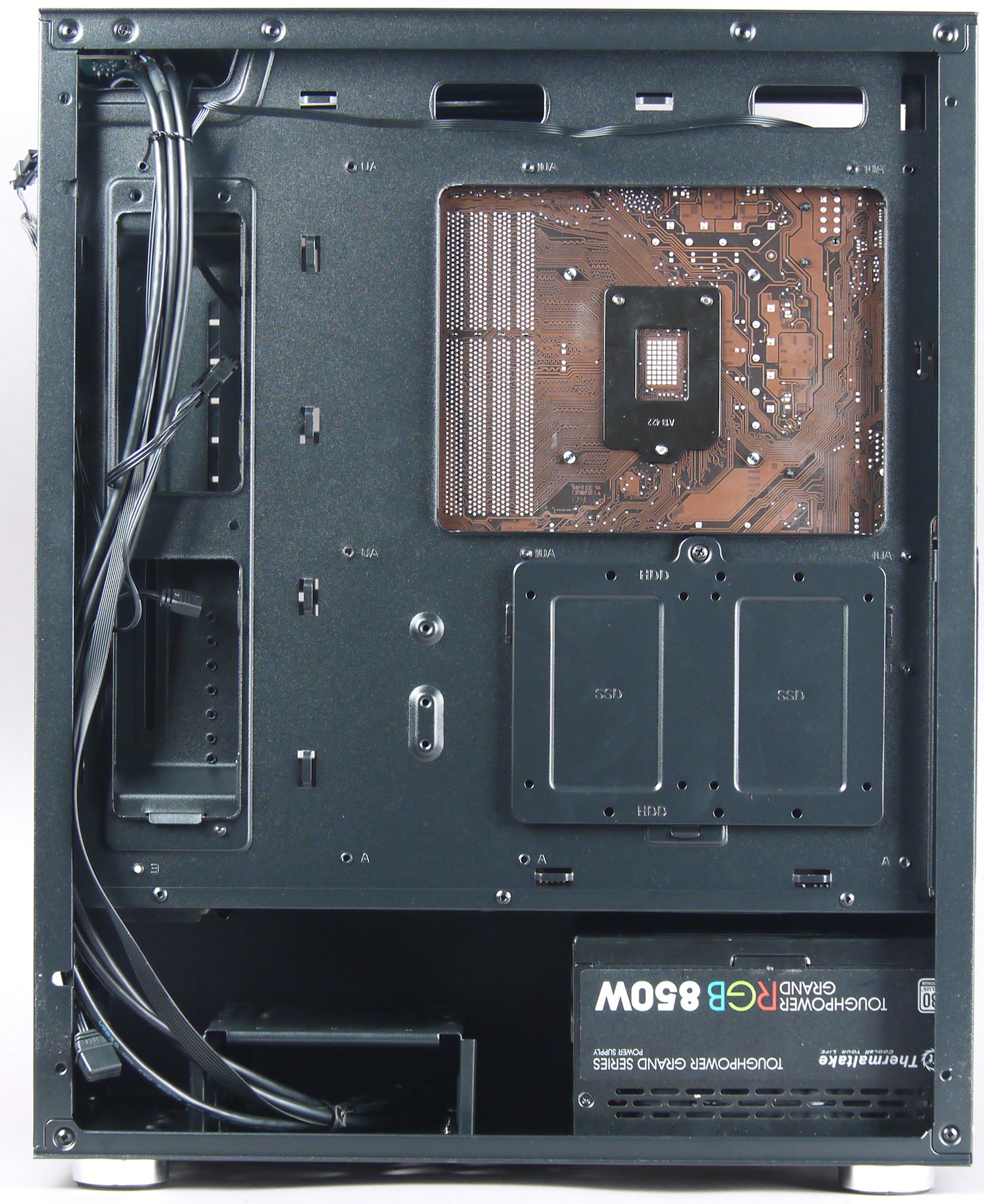 Между основанием для системной платы и правой боковой стенкой остается около 19 мм, чего вполне достаточно для прокладки кабелей. Для их аккуратного монтажа предусмотрены штампованные «ушки», а в комплекте есть пять одноразовых стяжек.