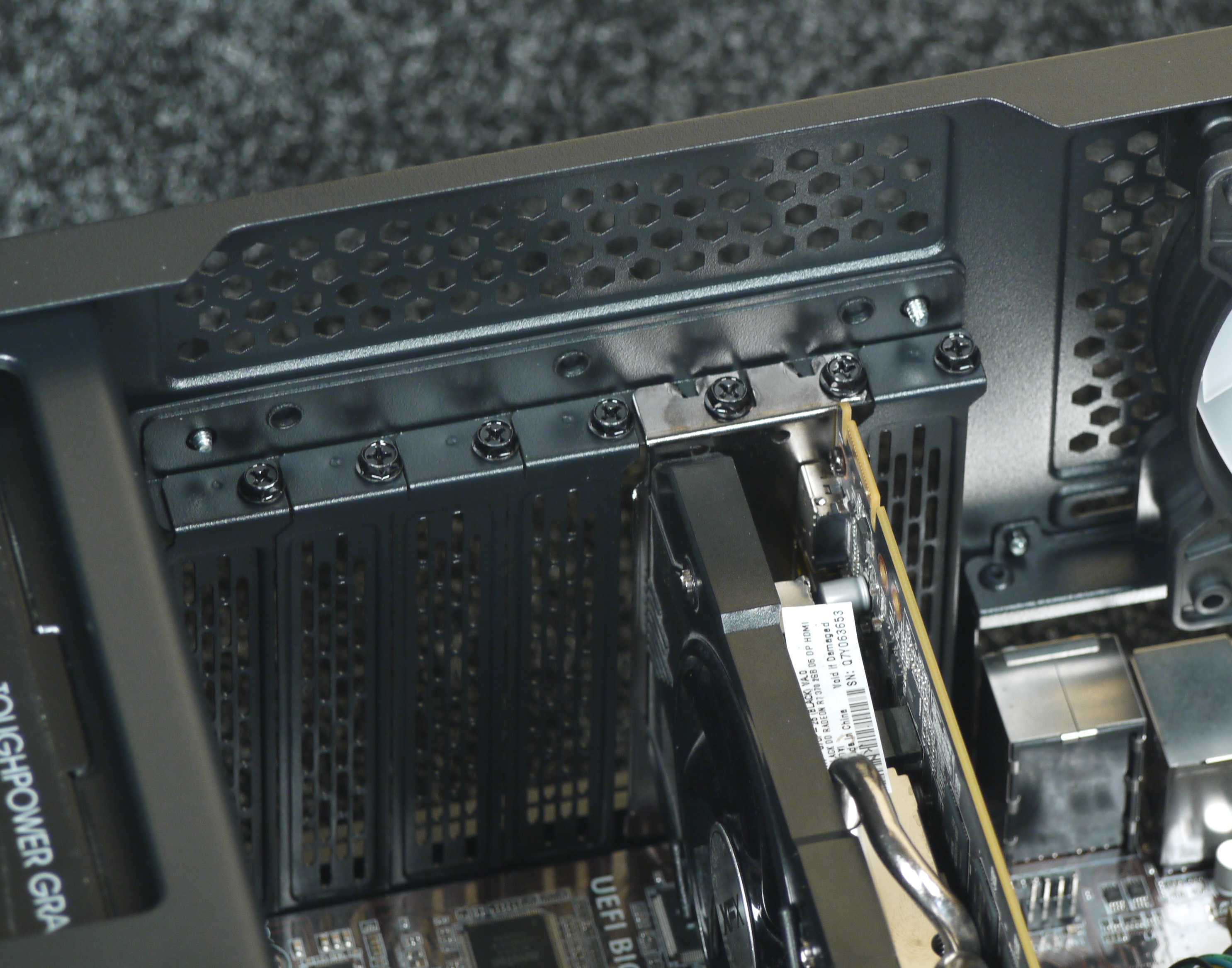 Заглушки и платы расширения в прорезях крепятся винтами с головками под крестовую отвертку, доступ к ним изнутри корпуса. Блок с прорезями и заглушками сделан съемным, даже крепится он винтами с большими пластиковыми головками, но смысл такого конструктивного решения остается непонятным: повернуть его на 90 градусов для вертикальной установки видеокарт не получится, в инструкции подобное также не упоминается.