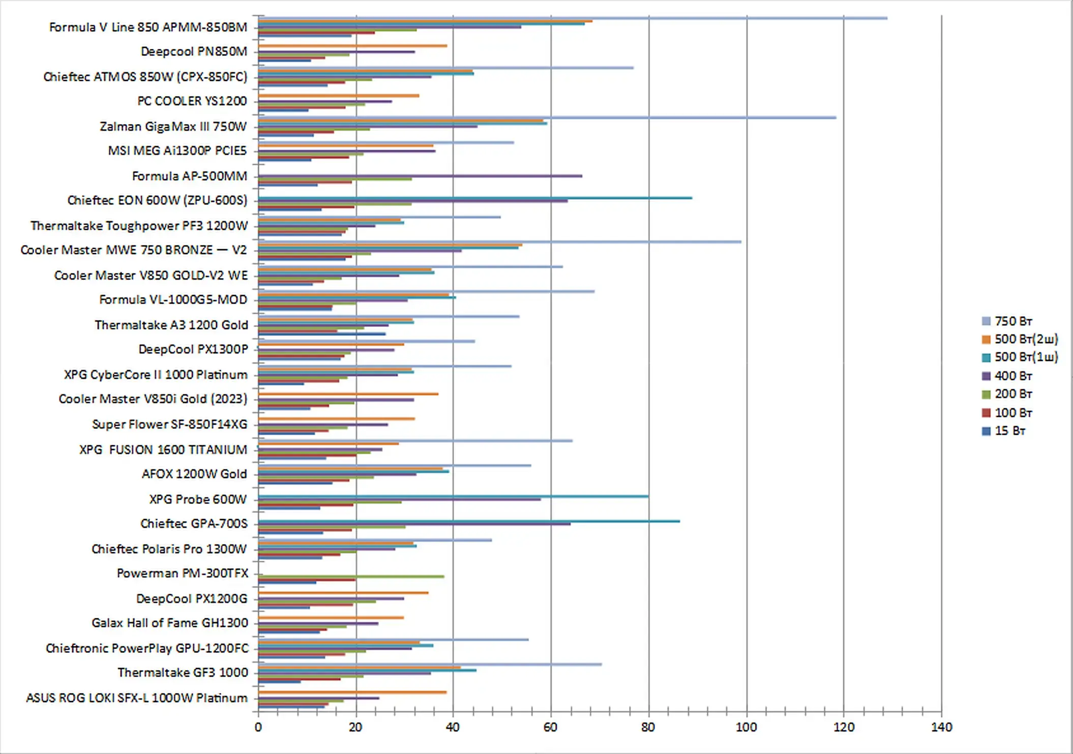 | Chieftec Atmos 850W (CPX-850FC) | 257 | 1033 | 1957 | 3816 | 4768 | 4765 | 7245 |