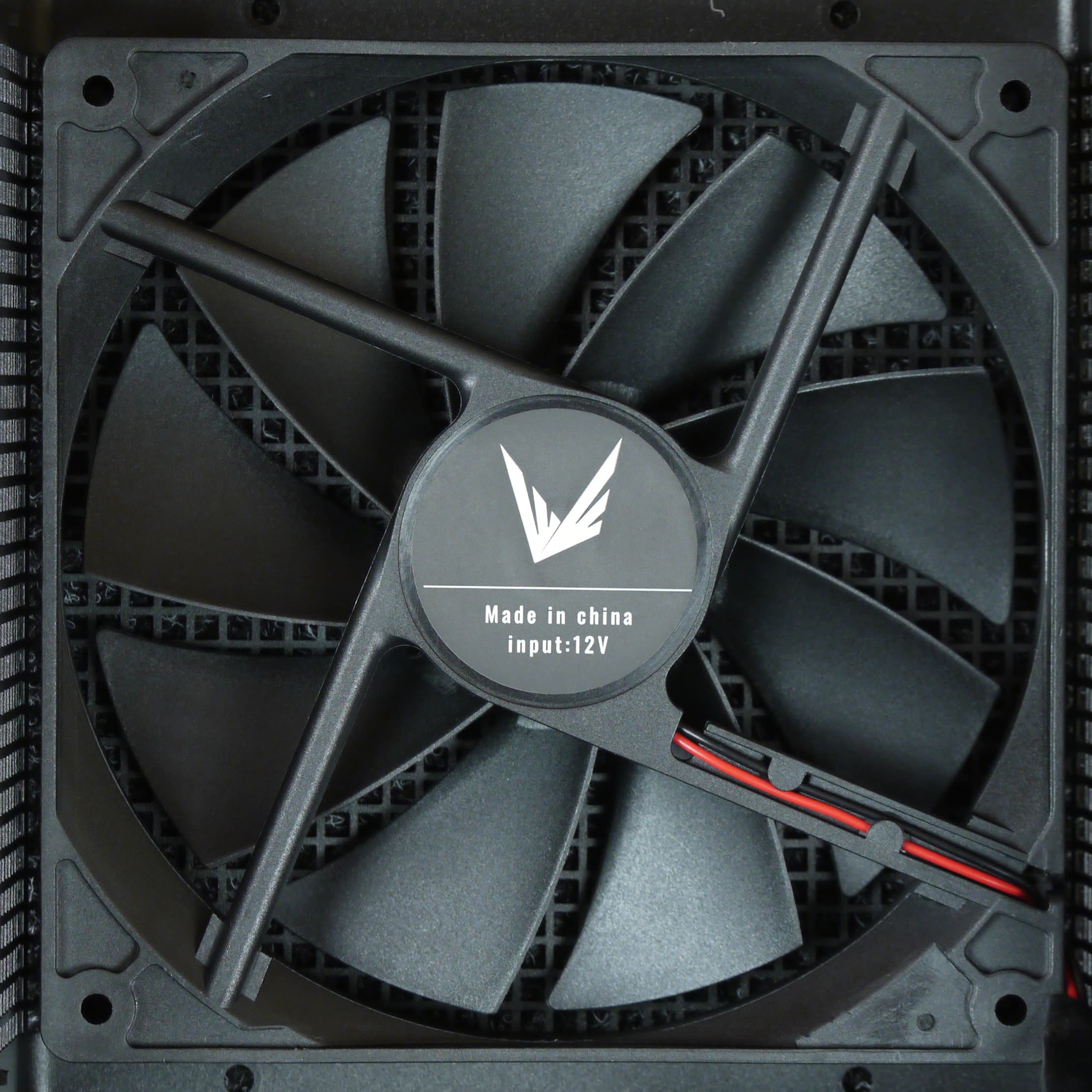 Под решеткой установлен вентилятор под собственной торговой маркой. Никакого описания этой модели нам обнаружить не удалось. Производитель заявляет, что он основан на гидродинамическом подшипнике. Подключение вентилятора — стандартное двухпроводное с разъемом.