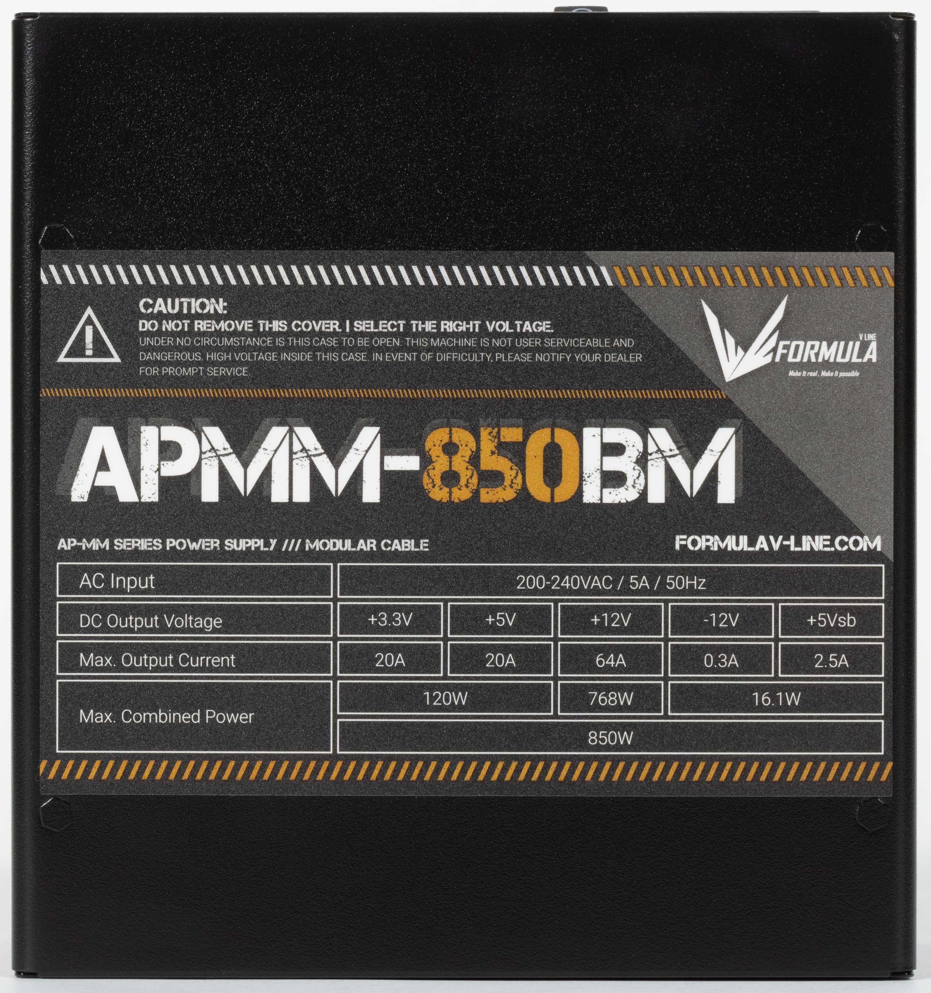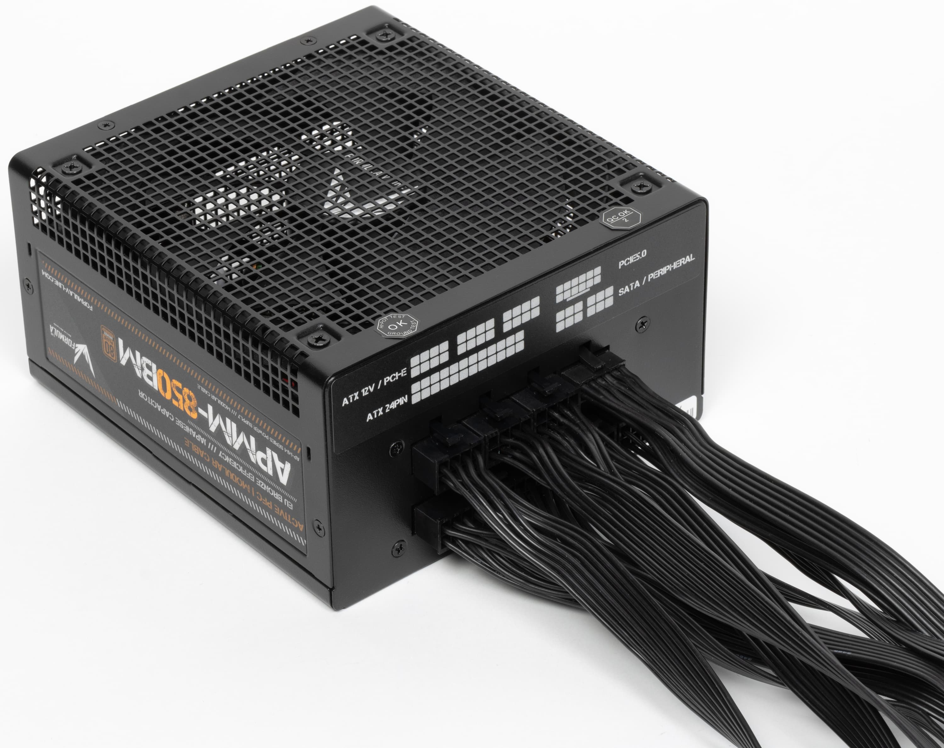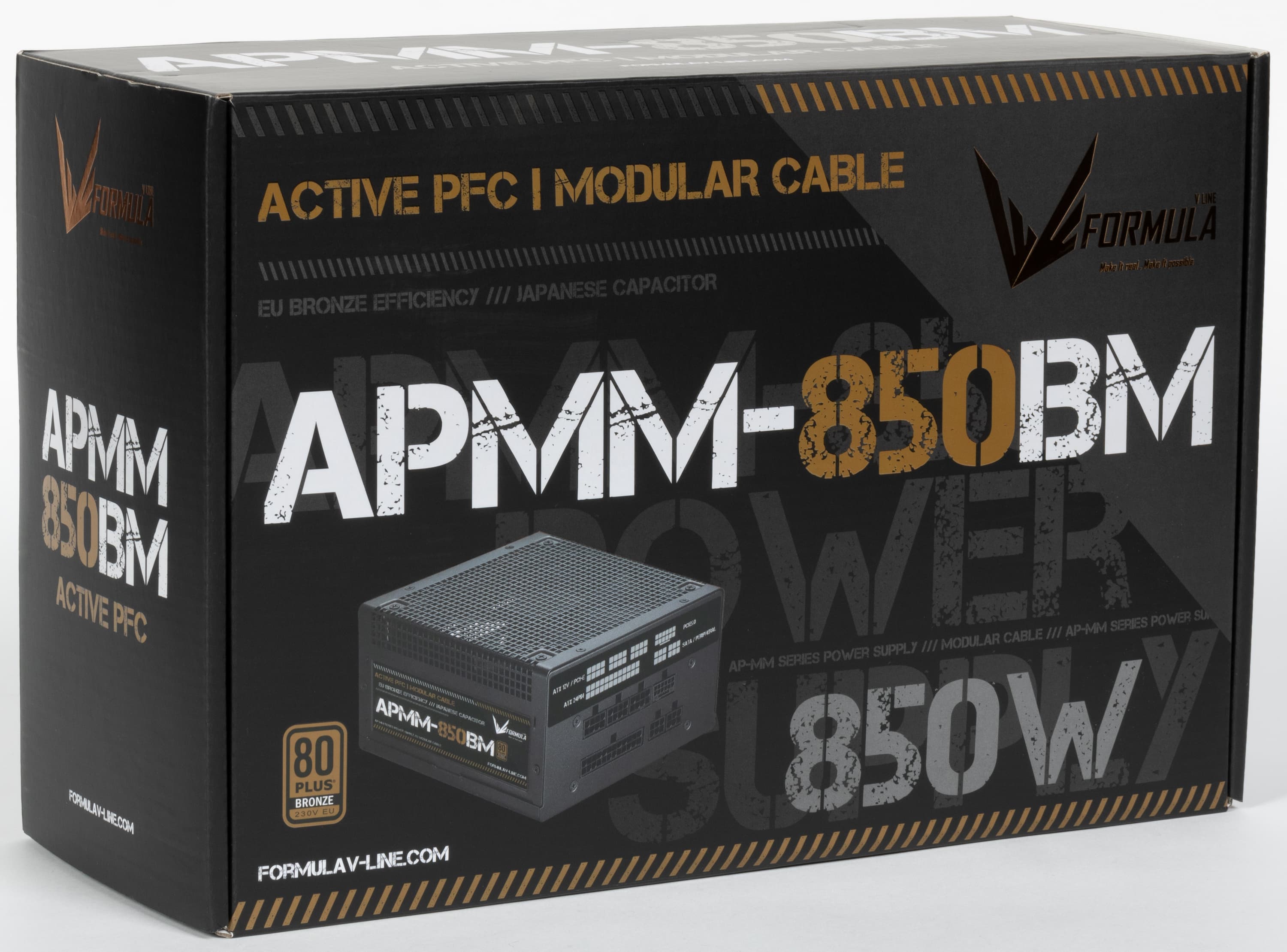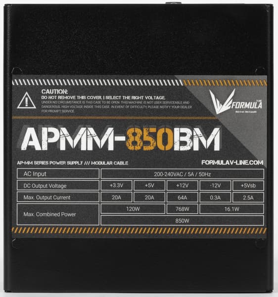 К нам на тестирование попал очередной БП под торговой маркой Formula V Line — модель APMM-850BM. Это источник питания мощностью 850 Вт, также в данной серии присутствуют модели мощностью 650 и 750 Вт, а наиболее ходовых решений мощностью 500-550 Вт нет. Все модели серии имеют сертификат 80Plus Bronze и новый разъем питания для видеокарт PCIe 5.0 (12VHPWR).
