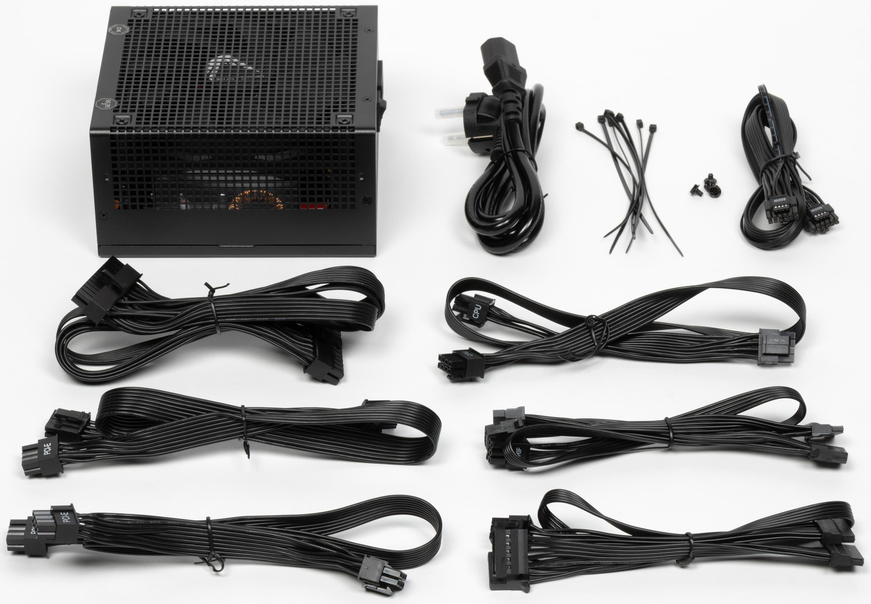 - 2 шнура: до первого разъема питания видеокарты PCIe 2.0 VGA Power Connector — 55 см, плюс еще 15 см до второго такого же разъема