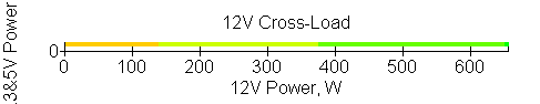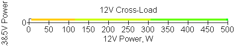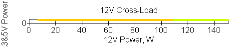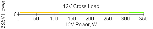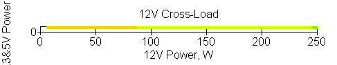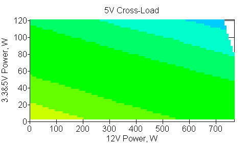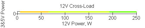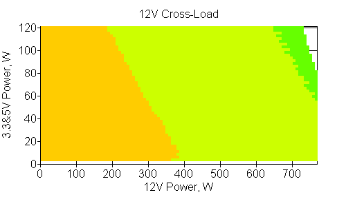 Следующим этапом инструментального тестирования является построение кросснагрузочной характеристики (КНХ) и представление ее на четвертьплоскости, ограниченной максимальной мощностью по шине 3,3&5 В с одной стороны (по оси ординат) и максимальной мощностью по шине 12 В с другой (по оси абсцисс). В каждой точке измеренное значение напряжения обозначается цветовым маркером в зависимости от отклонения от номинального значения.
