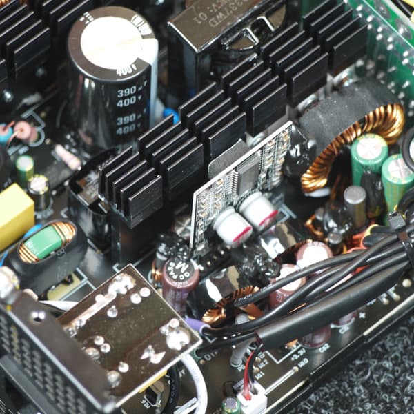 Основные полупроводниковые элементы установлены на двух компактных радиаторах с небольшим оребрением. Независимые источники каналов +3.3VDC и +5VDC размещены как на основной, так и на дочерней печатной плате и, по традиции, дополнительных теплоотводов не имеют — это вполне типично для блоков питания с активным охлаждением.