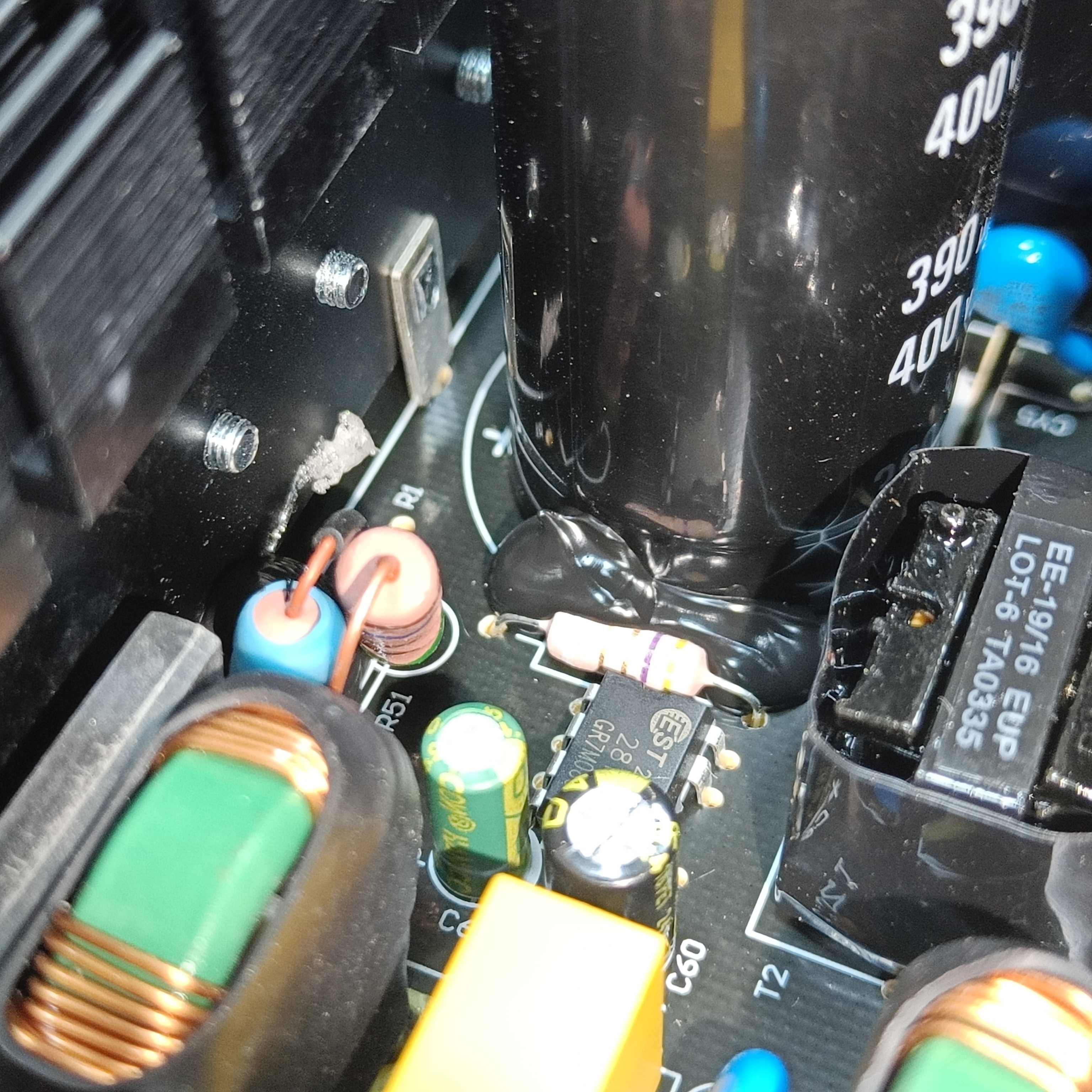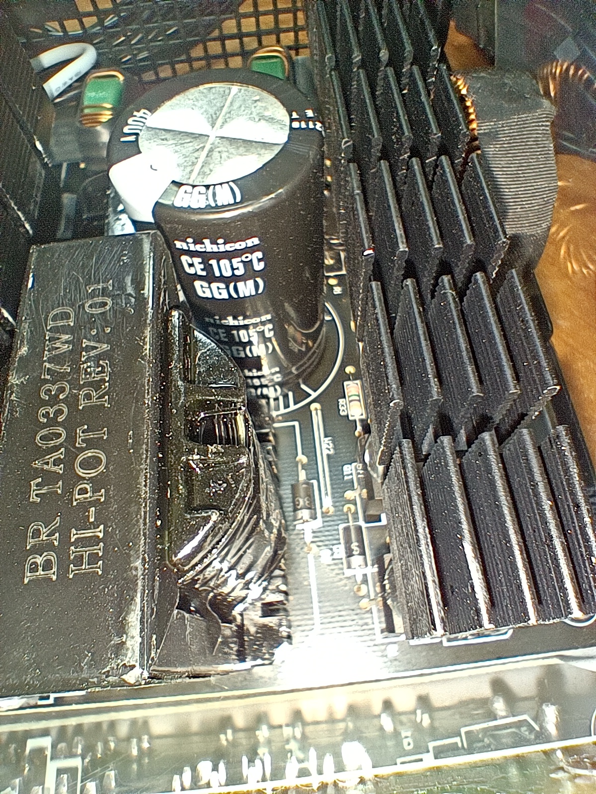 Заявленный японский конденсатор тут есть — один единственный. Установлен он в высоковольтной цепи и особо сильных тепловых нагрузок обычно не испытывает. В качестве низковольтных конденсаторов применены решения малоизвестных производителей.