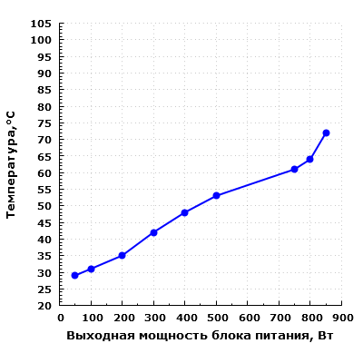 Тем не менее, мы провели измерение и в режиме общей мощности 850 Вт, но для него пришлось сильно задрать потребление по каналу +5VDC. Этот режим стоит рассматривать исключительно иллюстративно.