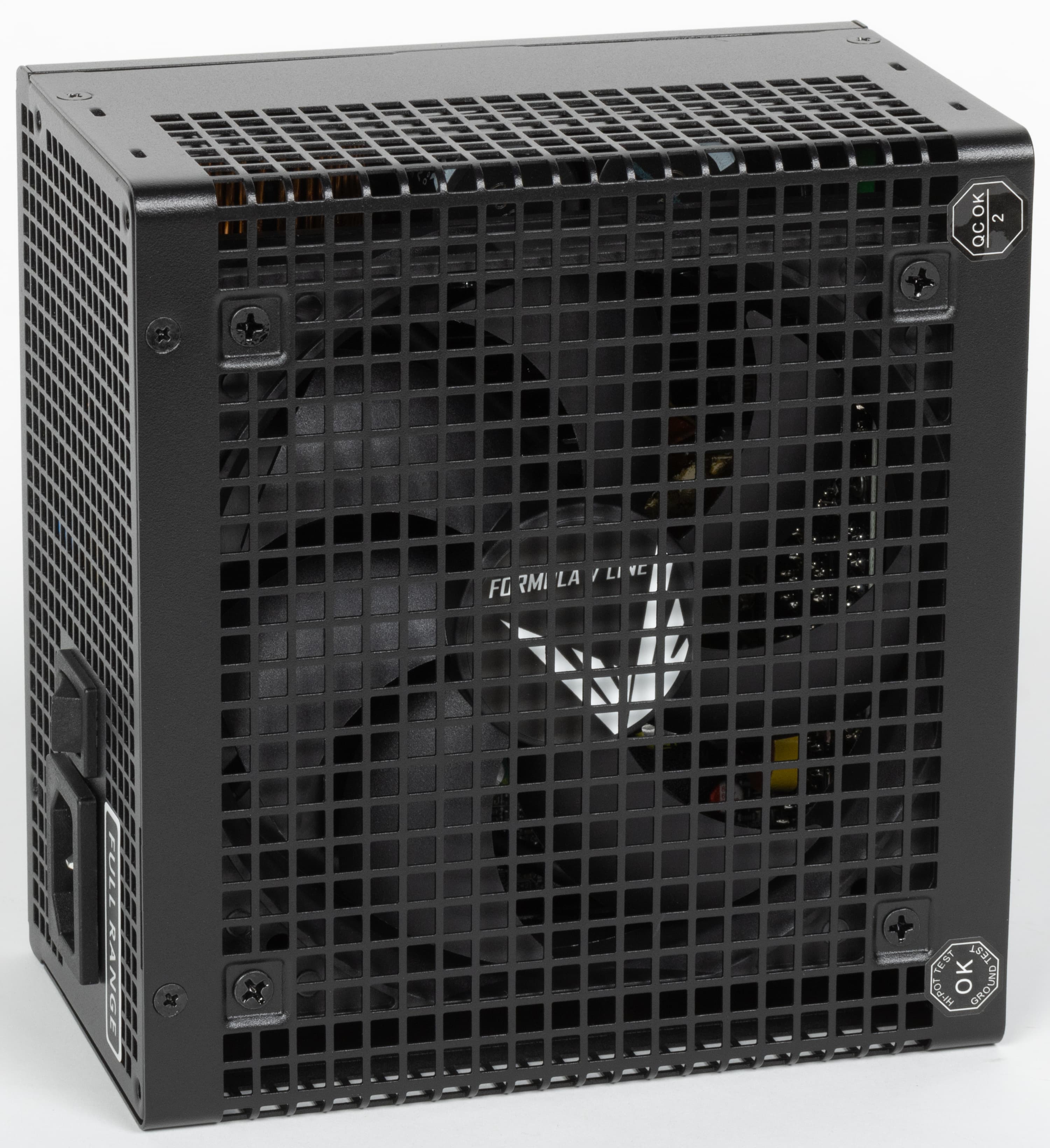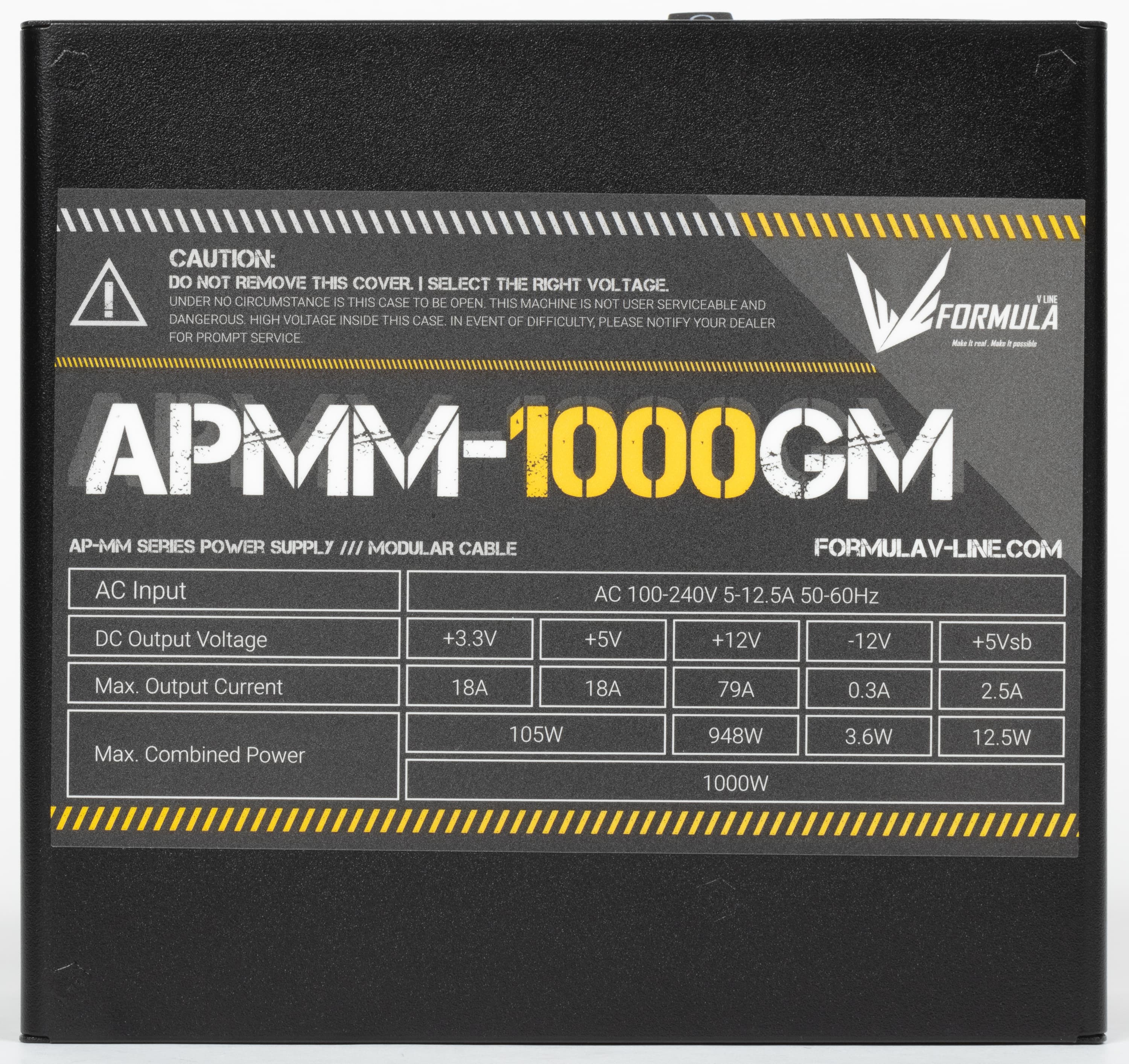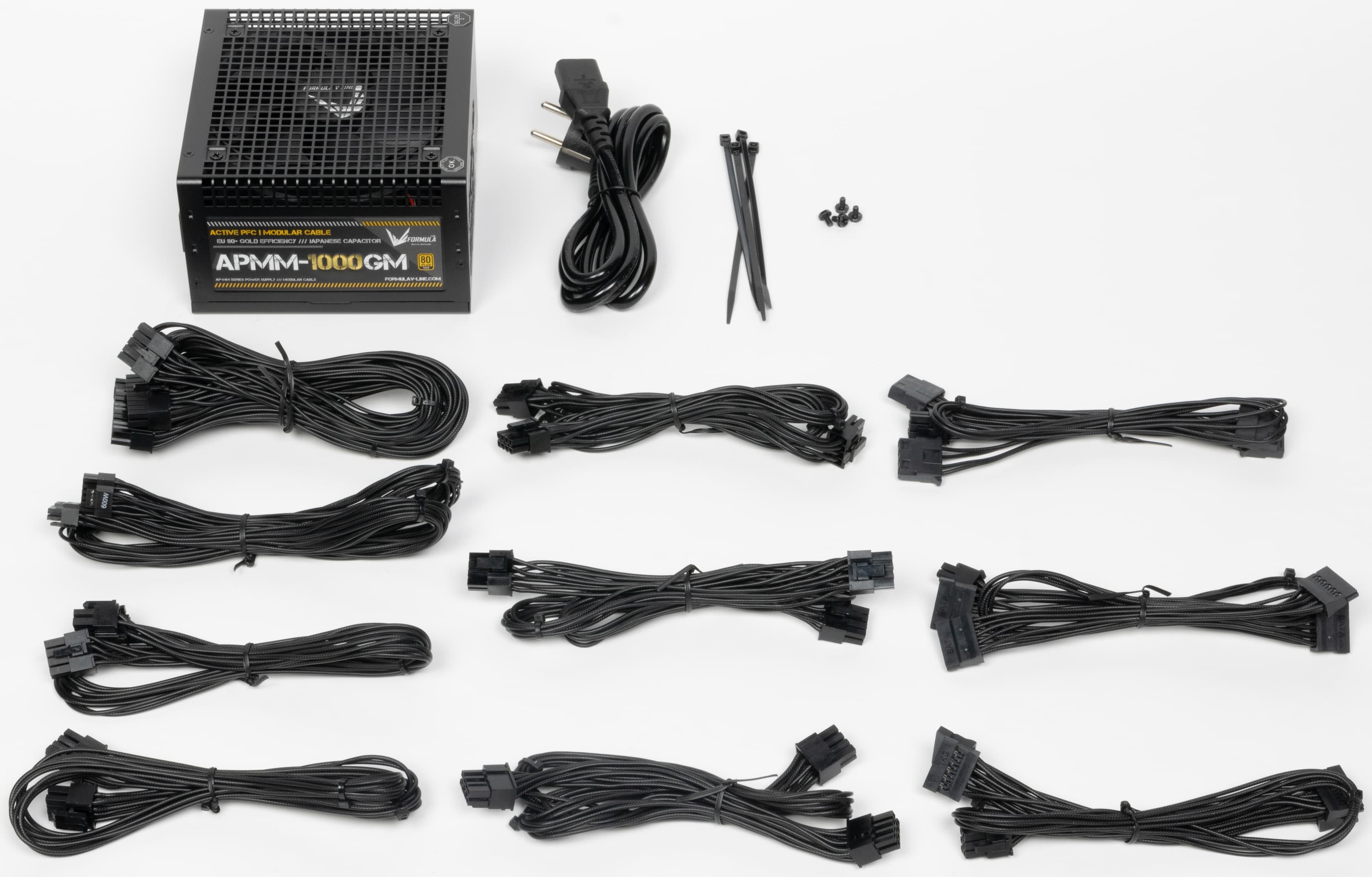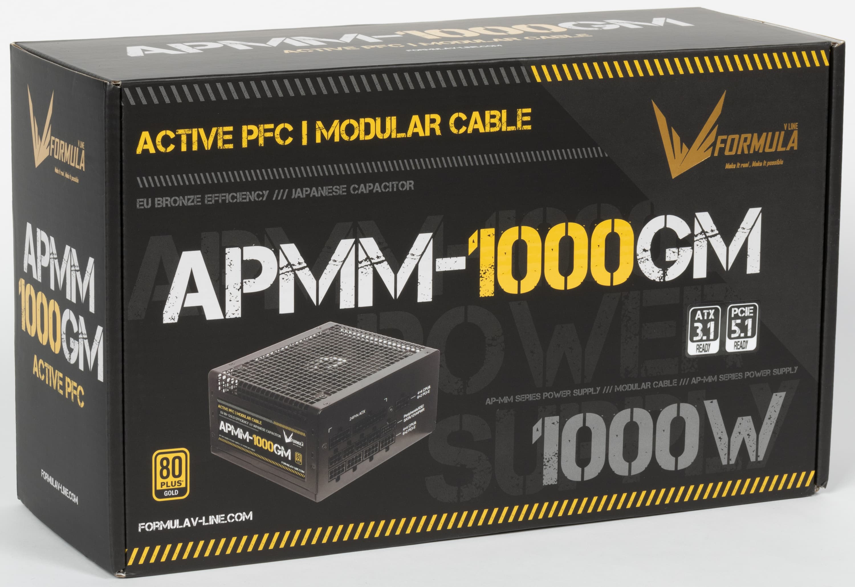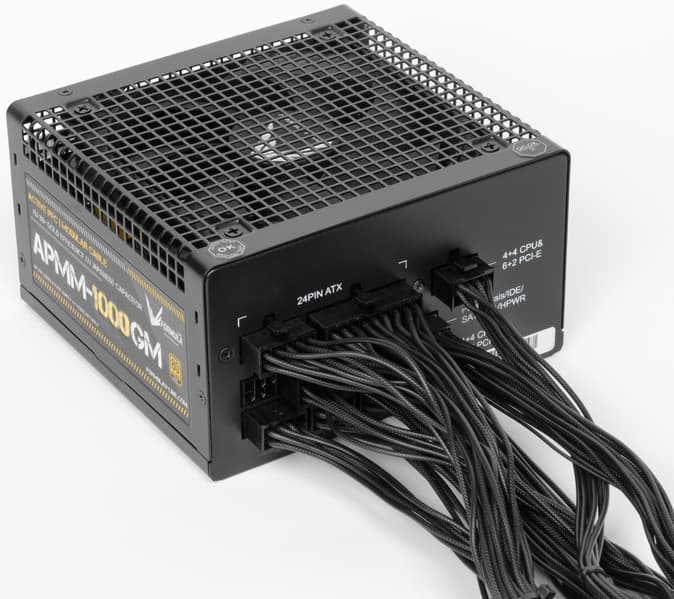 В этот раз к нам на тесты попал очередной продукт под торговой маркой Formula V-Line. Источники питания этого бренда уже встречались в наших обзорах. Блок питания имеет невразумительное, «каталожное» название APMM-1000GM. Он представляет собой источник питания с сертификатом 80Plus Gold. По нынешним временам это среднебюджетное решение — разумеется, для сегмента БП столь высокой мощности.