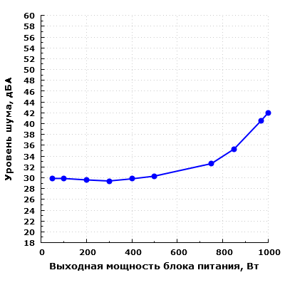 При работе на мощности 500 Вт шум блока питания находится на пониженном уровне для жилого помещения в дневное время суток — около 30 дБА с расстояния 0,35 метра.