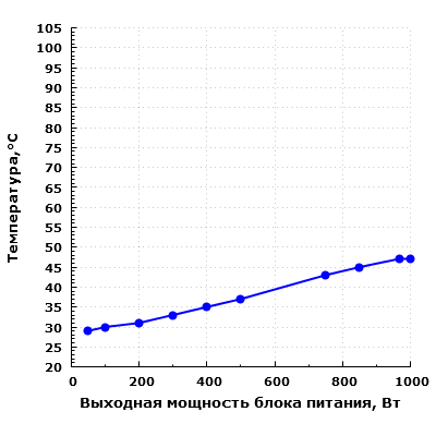В данном случае во всем диапазоне мощности термонагруженность конденсаторов находится на невысоком уровне, что можно оценить положительно. Это не удивительно с учетом того, что вентилятор здесь вращается всегда, и далеко не на минимальных оборотах.