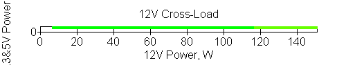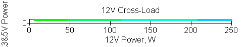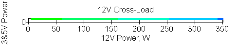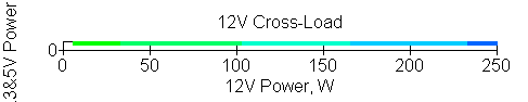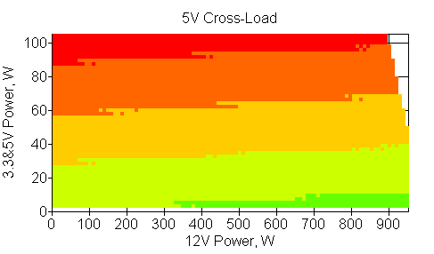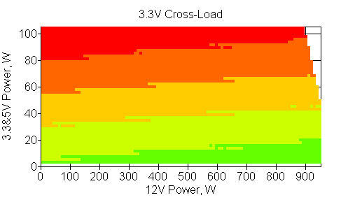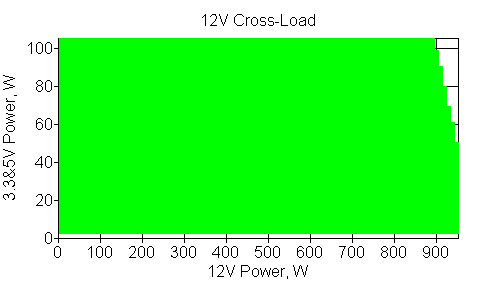 Следующим этапом инструментального тестирования является построение кросснагрузочной характеристики (КНХ) и представление ее на четвертьплоскости, ограниченной максимальной мощностью по шине 3,3&5 В с одной стороны (по оси ординат) и максимальной мощностью по шине 12 В с другой (по оси абсцисс). В каждой точке измеренное значение напряжения обозначается цветовым маркером в зависимости от отклонения от номинального значения.