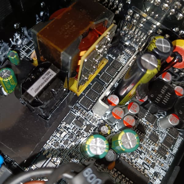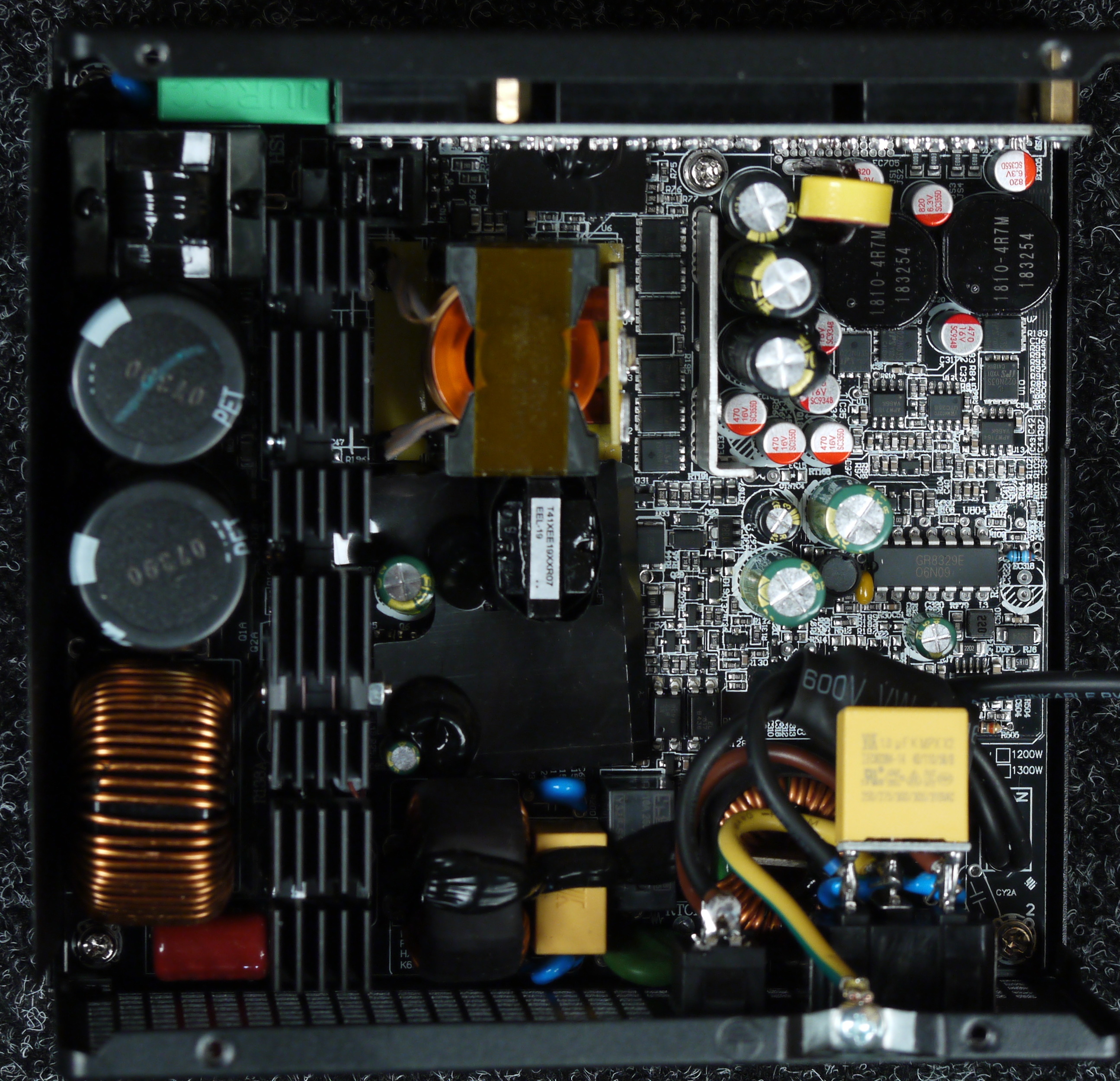 Конструкция блока питания вполне соответствует современным тенденциям: активный корректор коэффициента мощности, синхронный выпрямитель для канала +12VDC, независимые импульсные преобразователи постоянного тока для линий +3.3VDC и +5VDC.